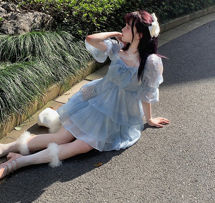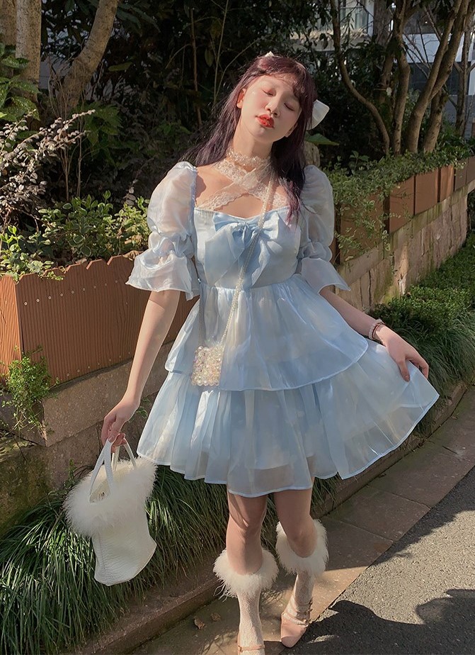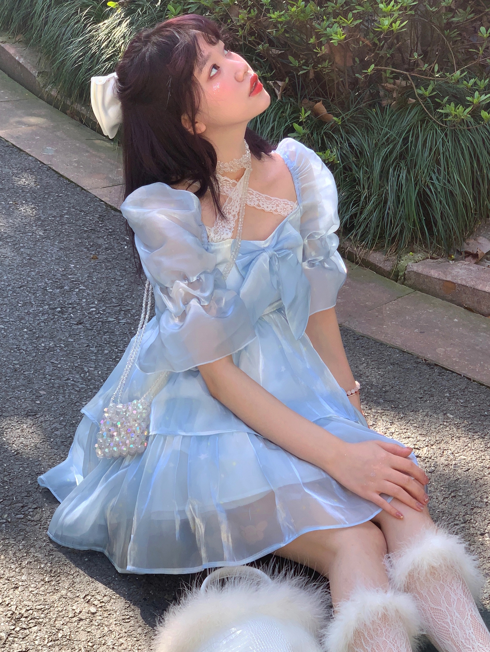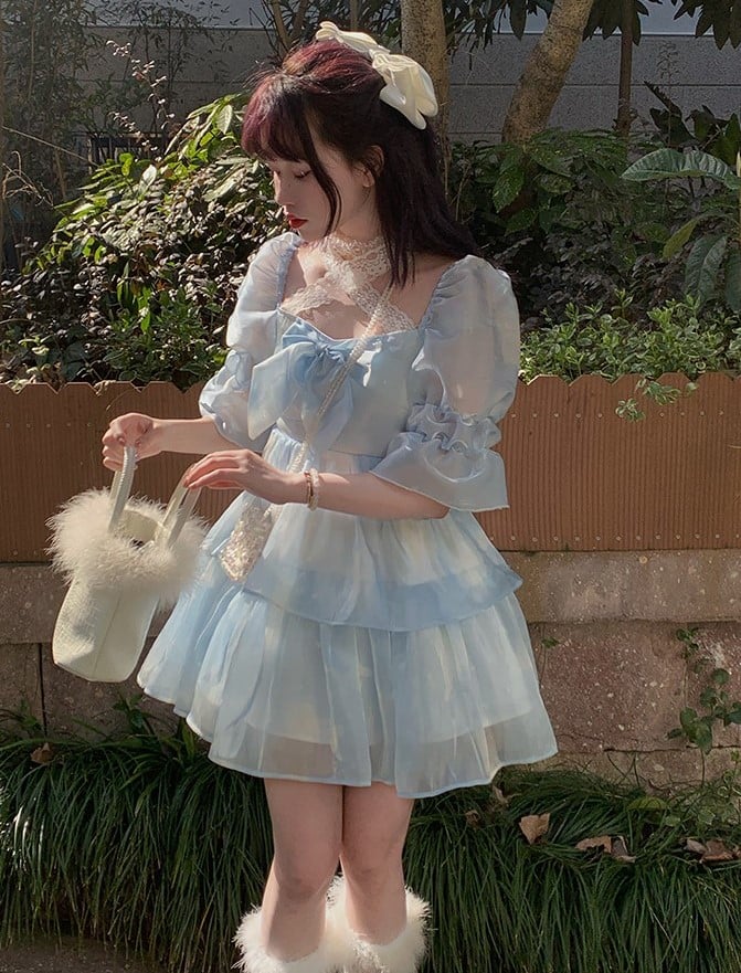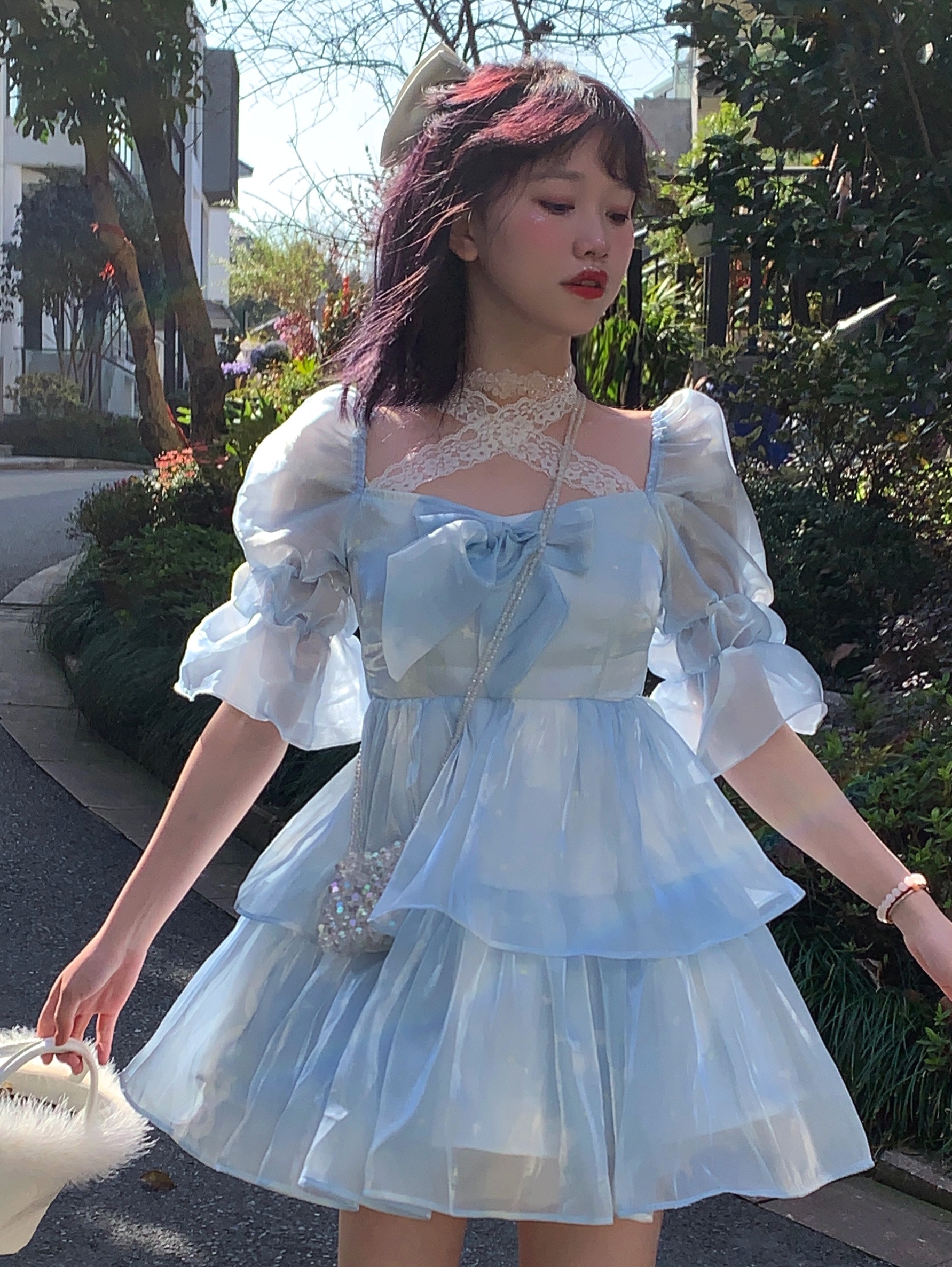 Mori Girl Princess Fairytale Cute Square Neck Lace Layered Tulle Blue Short Mini Dress