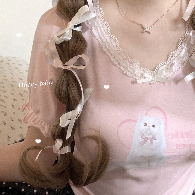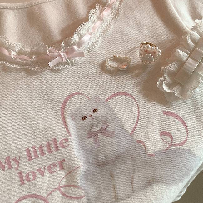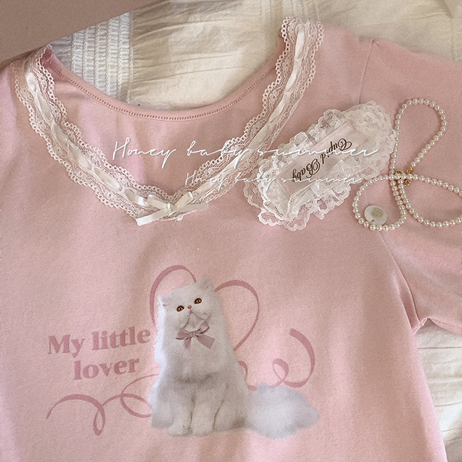 Persian Cat Kitten Cute Pattern Print Sweet Girl Women Fashion Puff Sleeve Lace Top Shirt