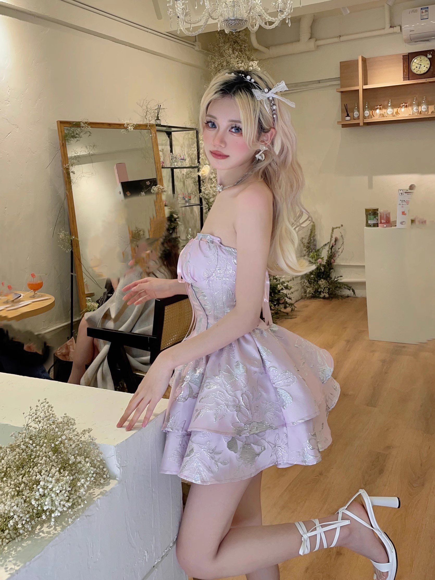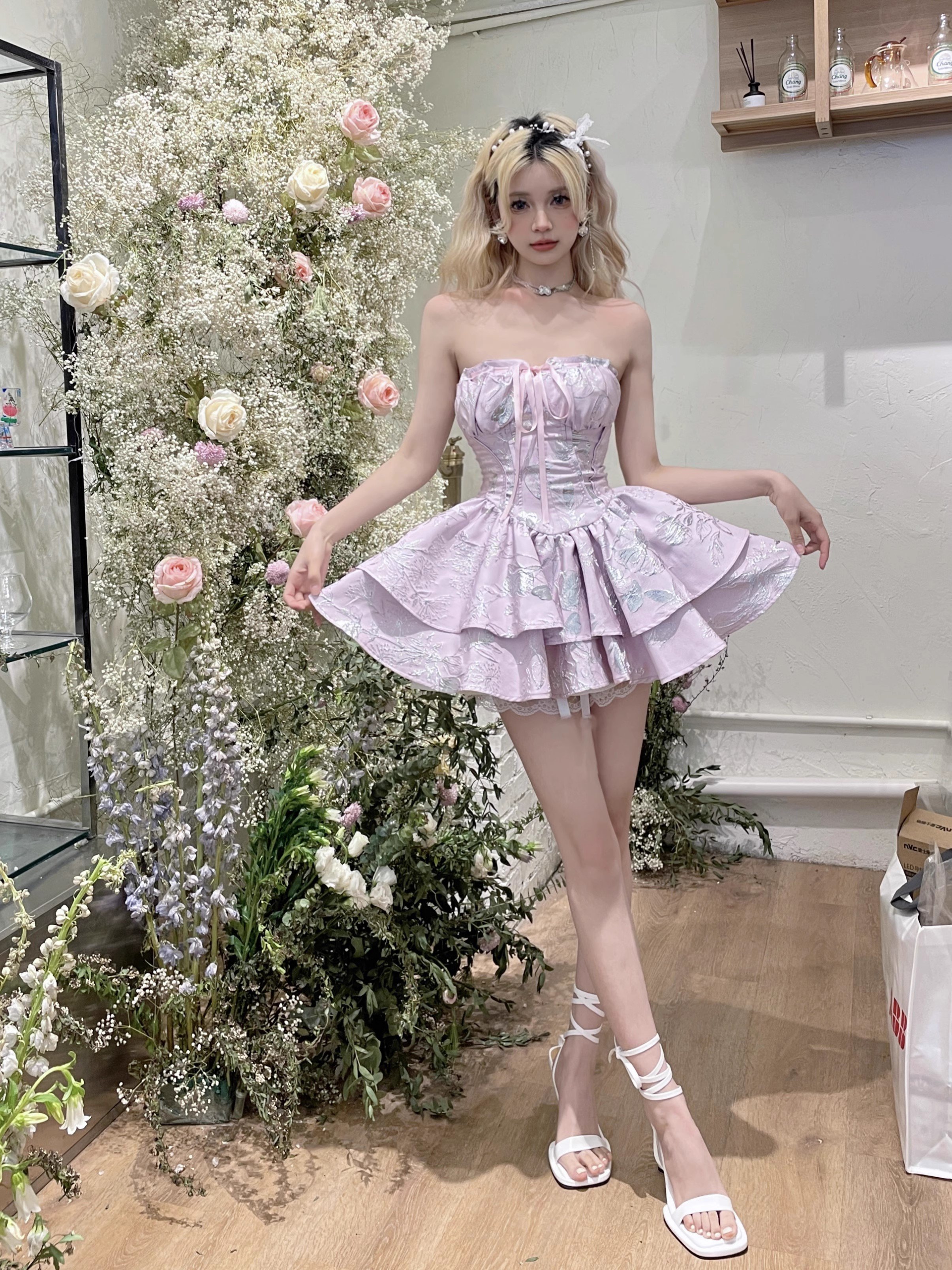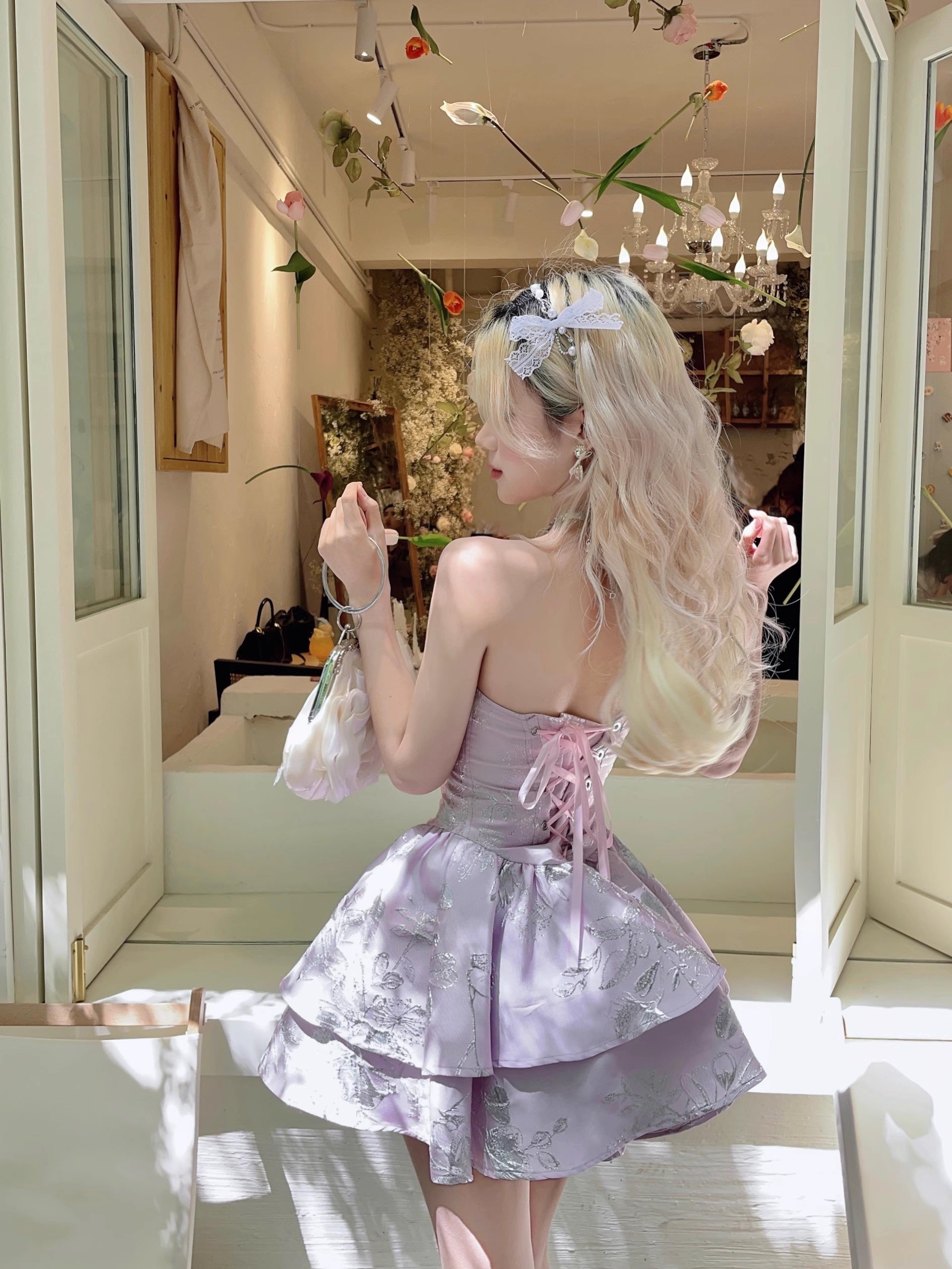 Lilac Purple Silver Leaves Nature Floral Flower Fairy Ribbon Balletcore Corset Strapless Dress