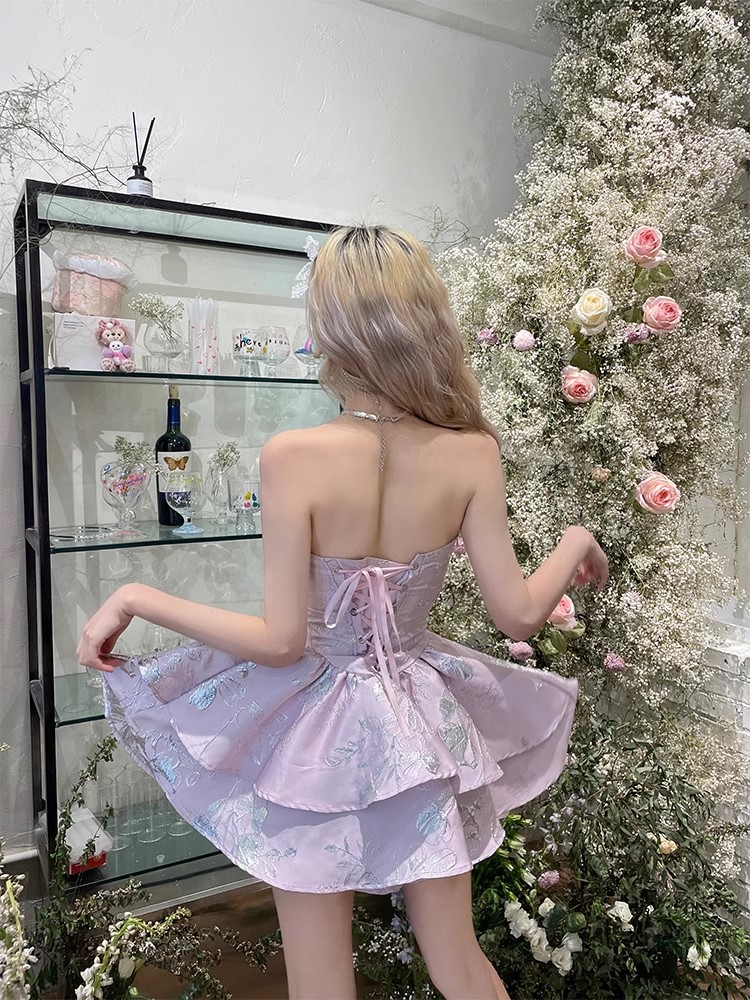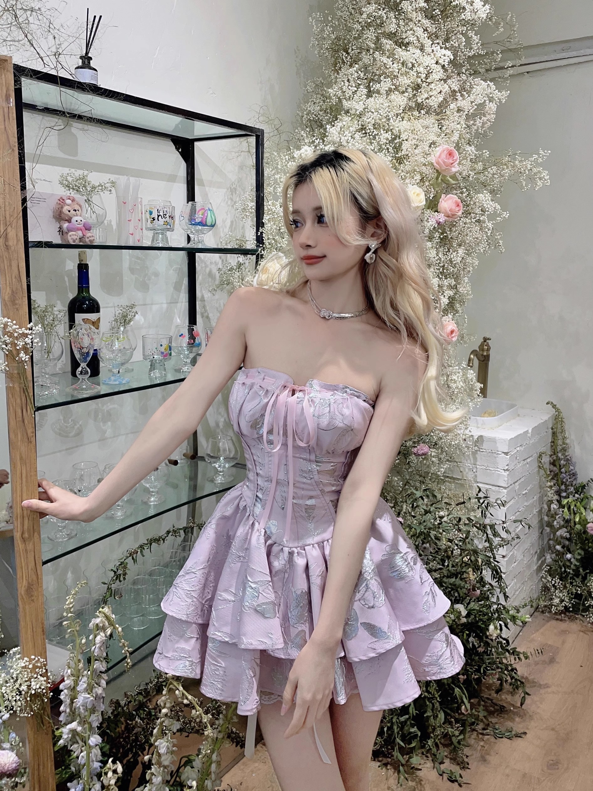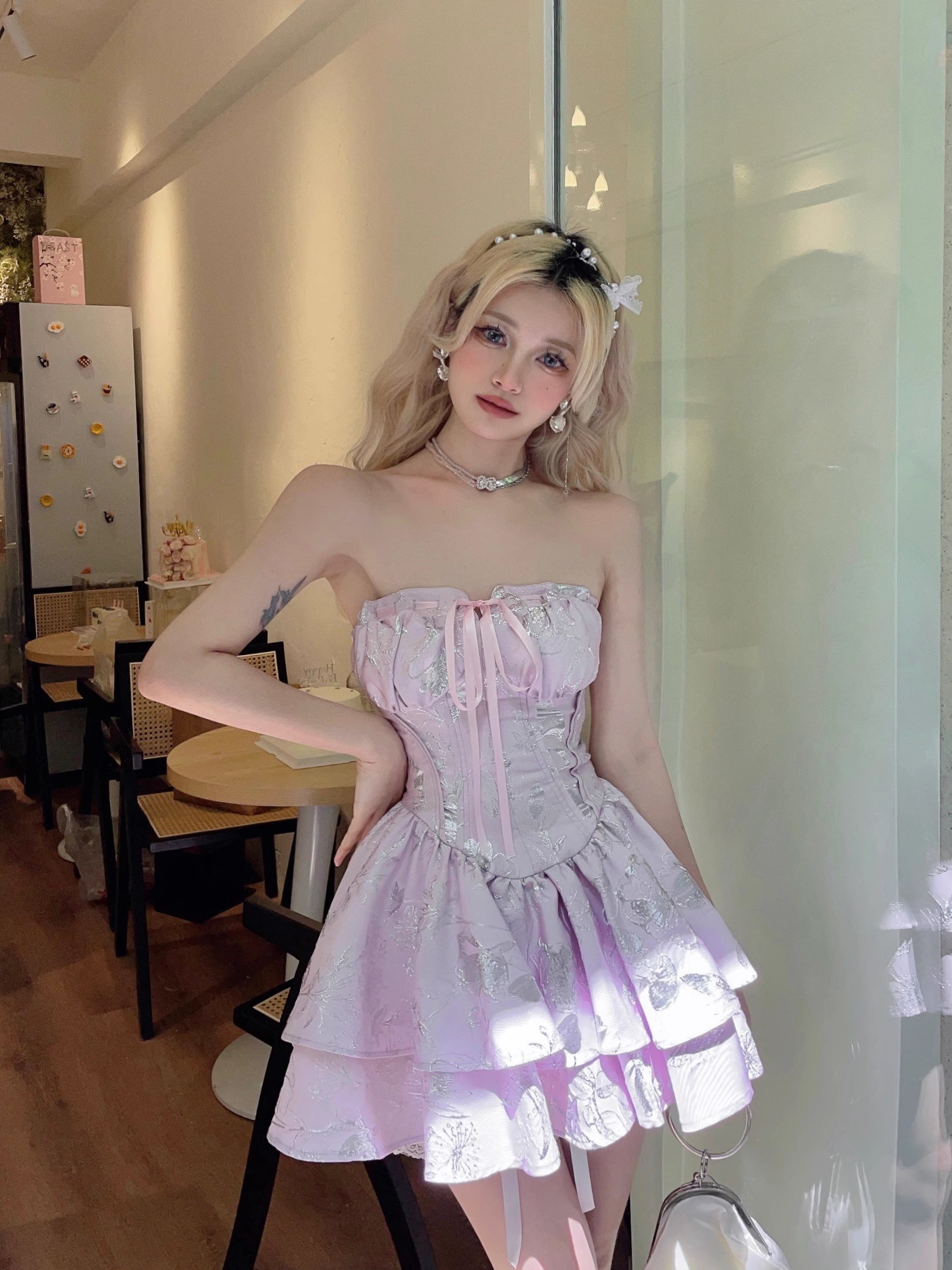 Lilac Purple Silver Leaves Nature Floral Flower Fairy Ribbon Balletcore Corset Strapless Dress
