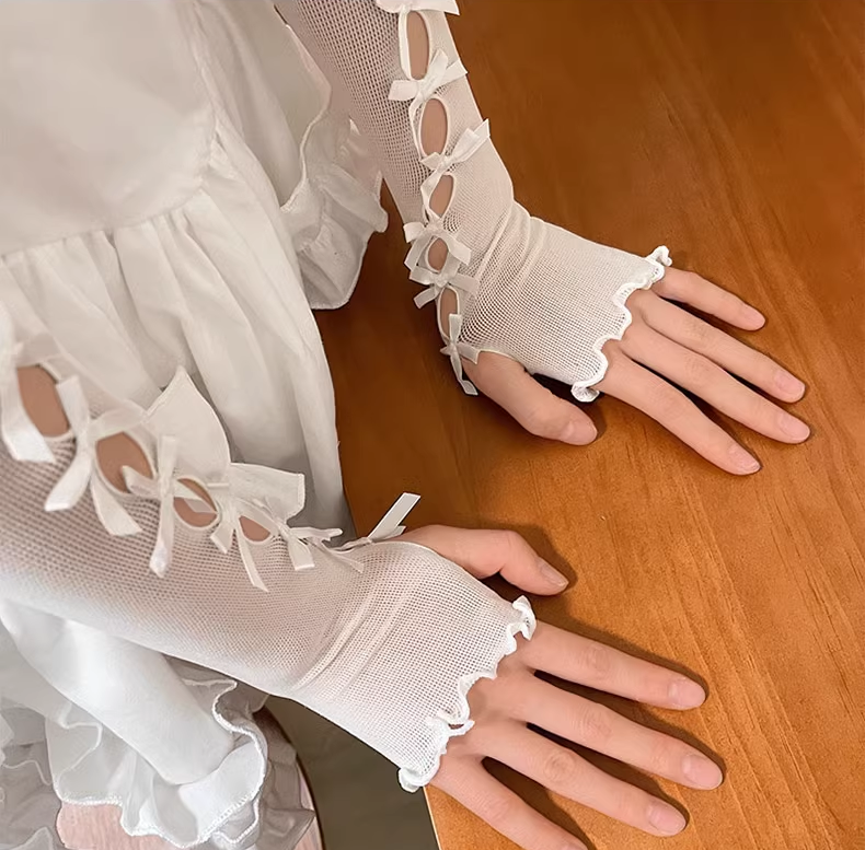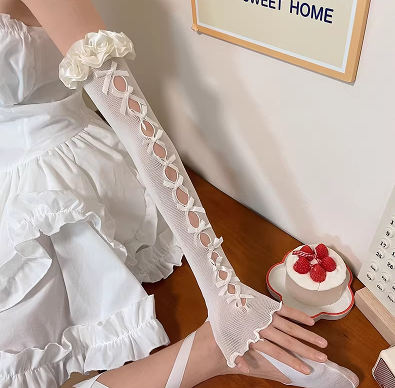 Sweet Coquette Girl Hollow Bow Ribbon White Black Arm Long Evening Gloves