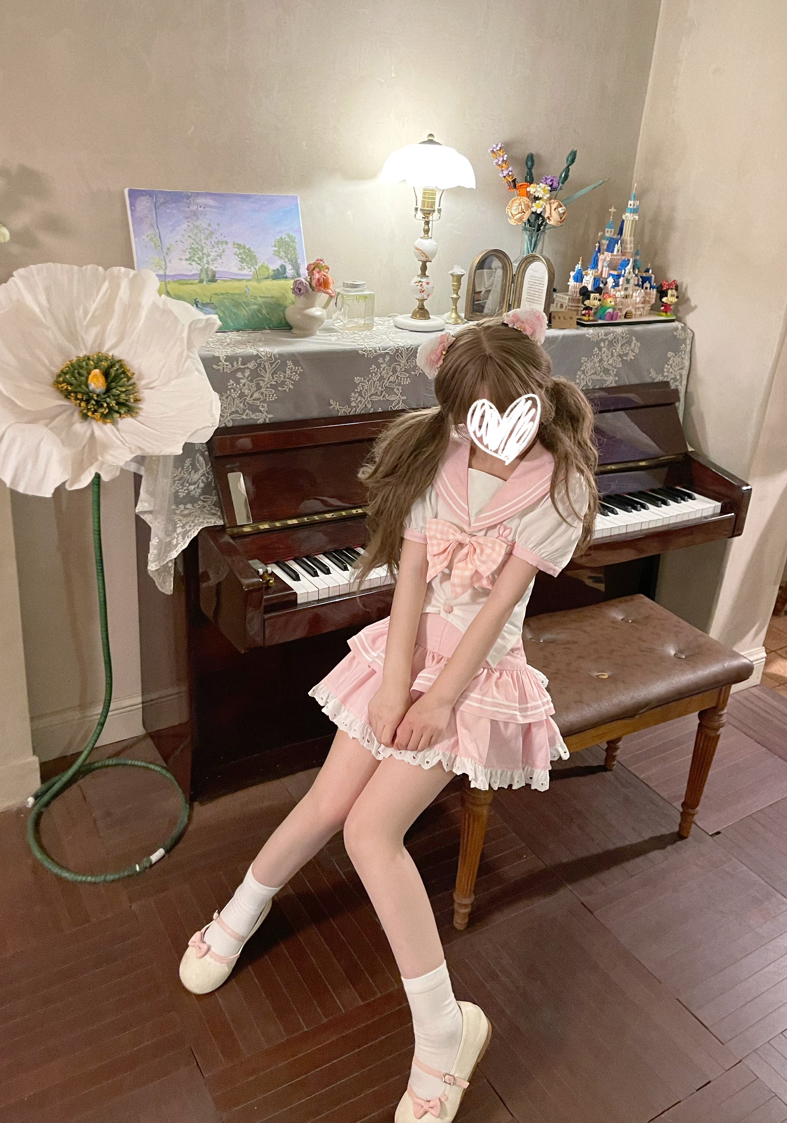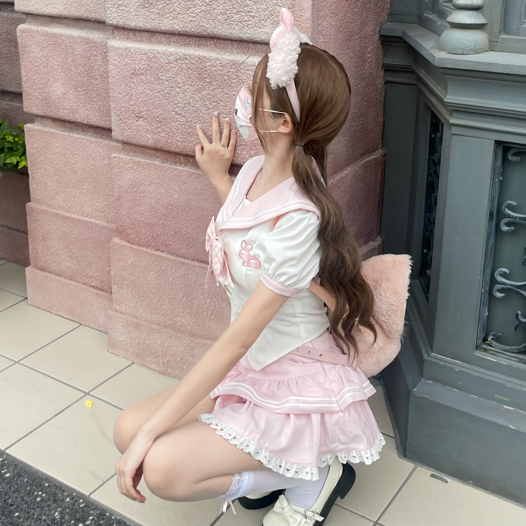 Sweet Rabbit Pink Plaid Sailor Collar Shirt & Skirt Set