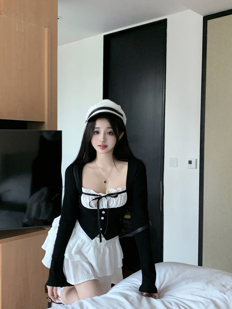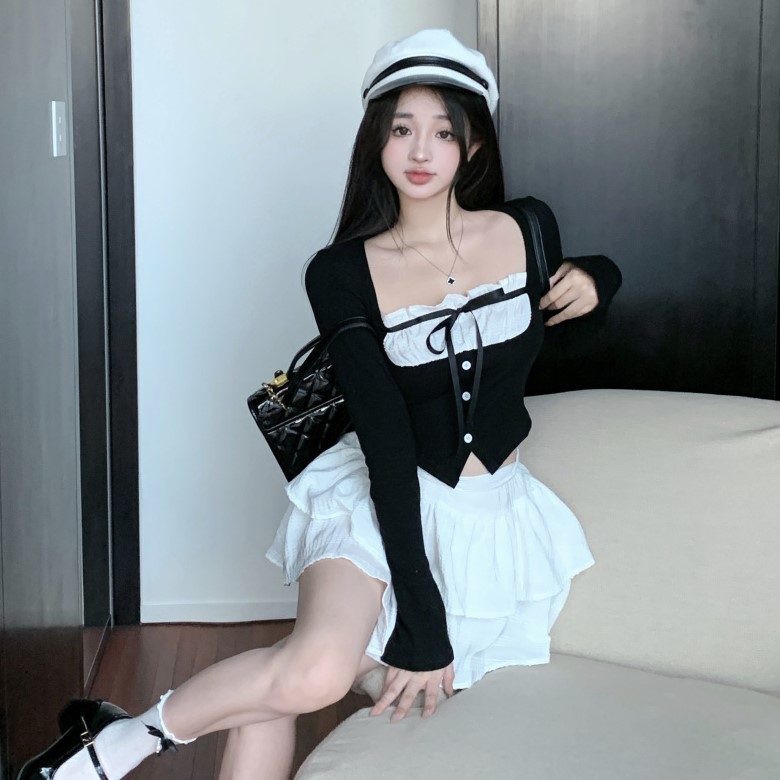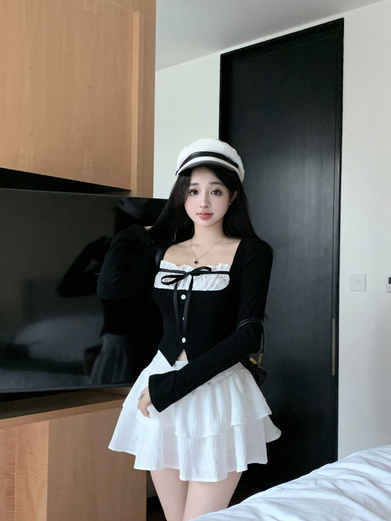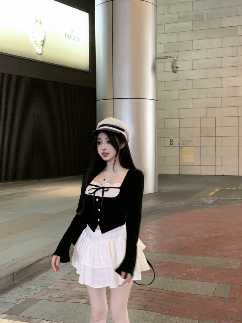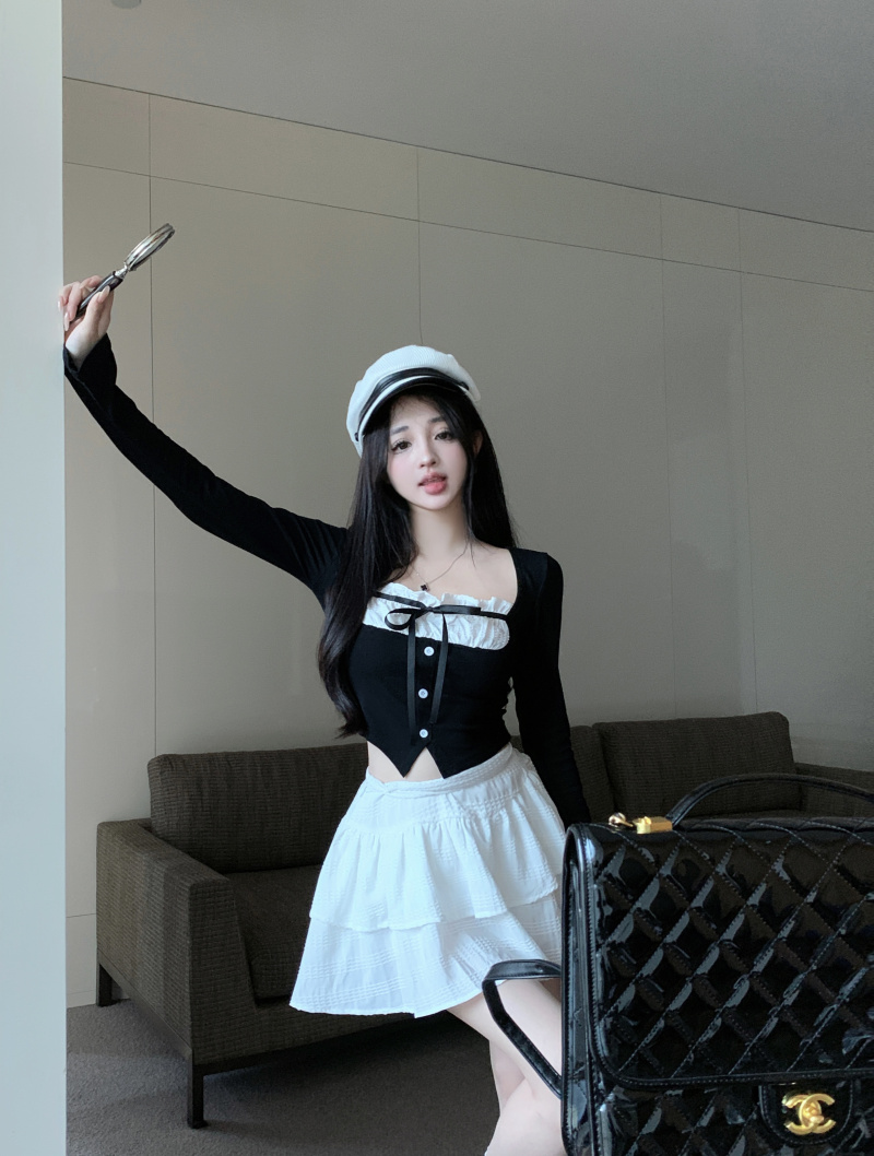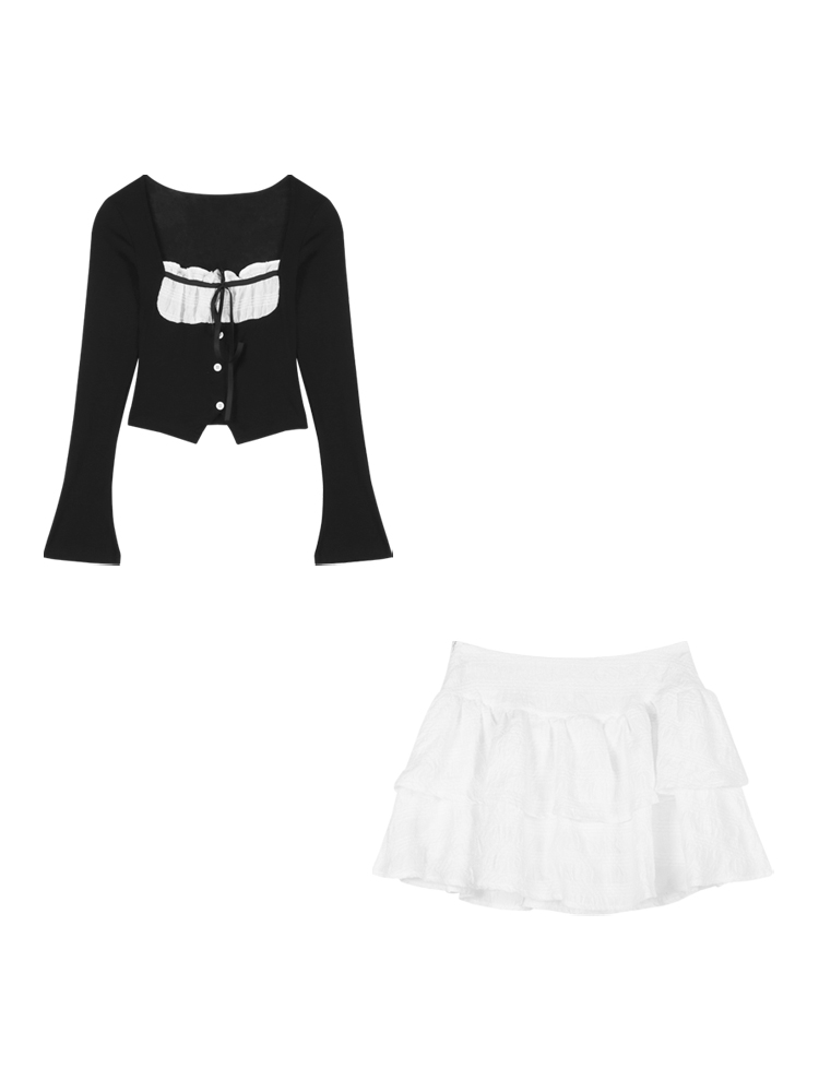 Balletcore Chic Bow Long Sleeve Black Top & White Short Skirt Set