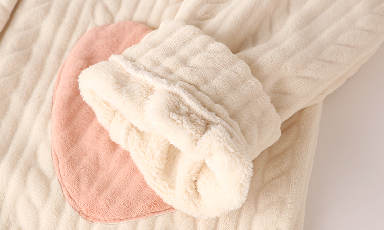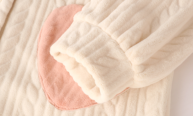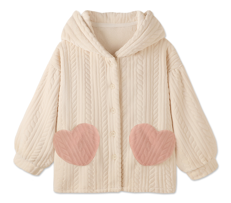 The top is very fluffy and warm. The cuffs help keep the temperature. Two pink heart pockets on the hem.