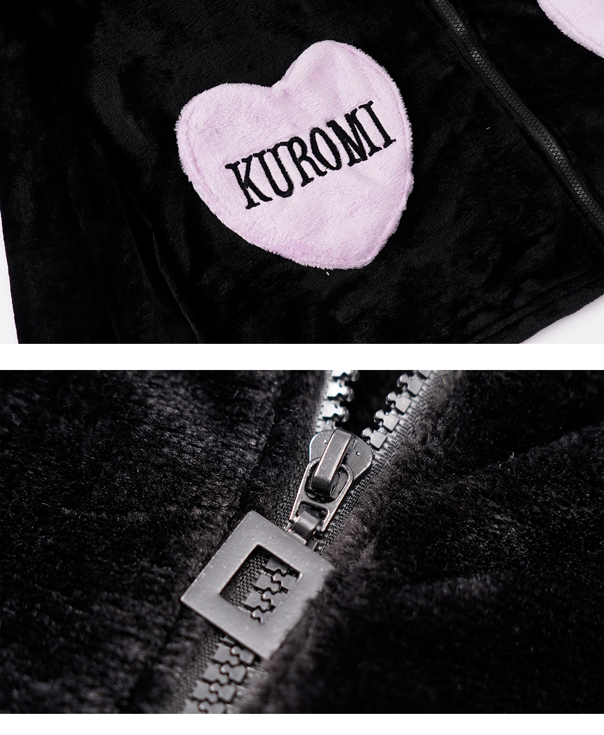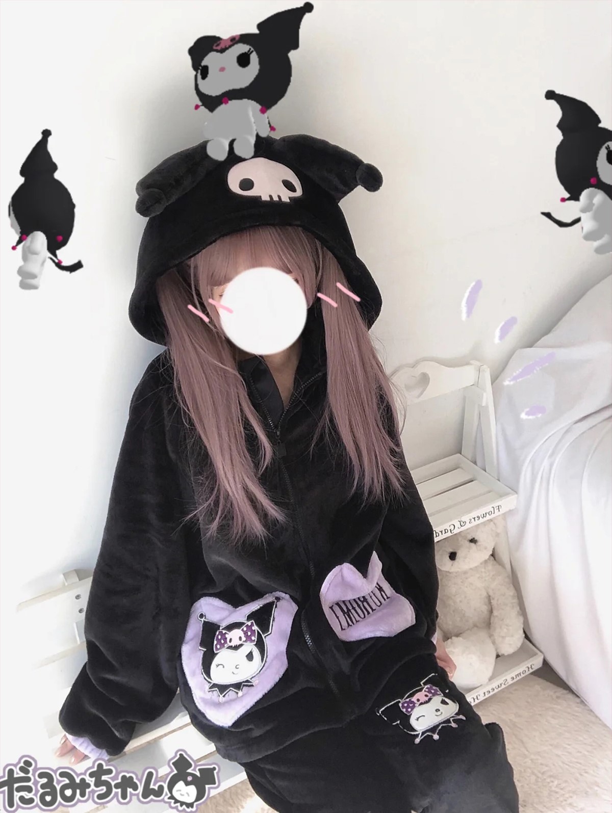 Black Kuromi Cute Cartoon Girl Plush Flannel Cozy Warm Winter Pajamas Sleepwear Long Sleeve Zip Up Hoodie Tops & Pants Two Piece