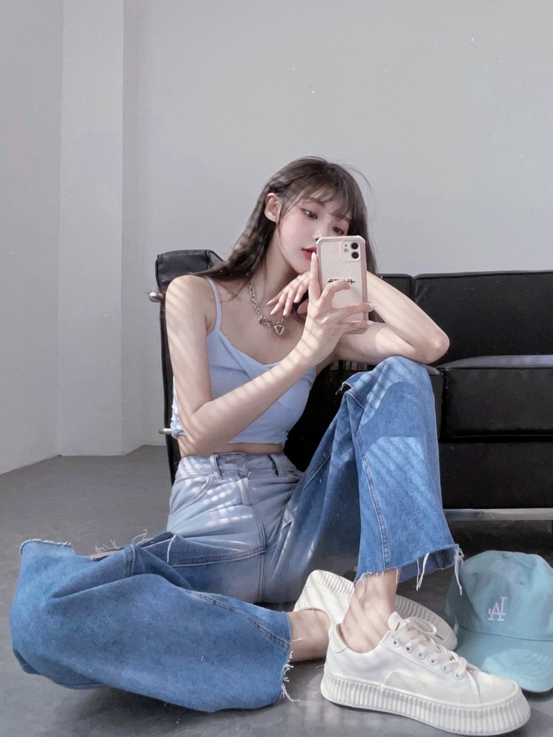 Hot Cool Summer High Waist Gradient White Blue Loose Wide Leg Trouser Pant Ripped Denim Jeans