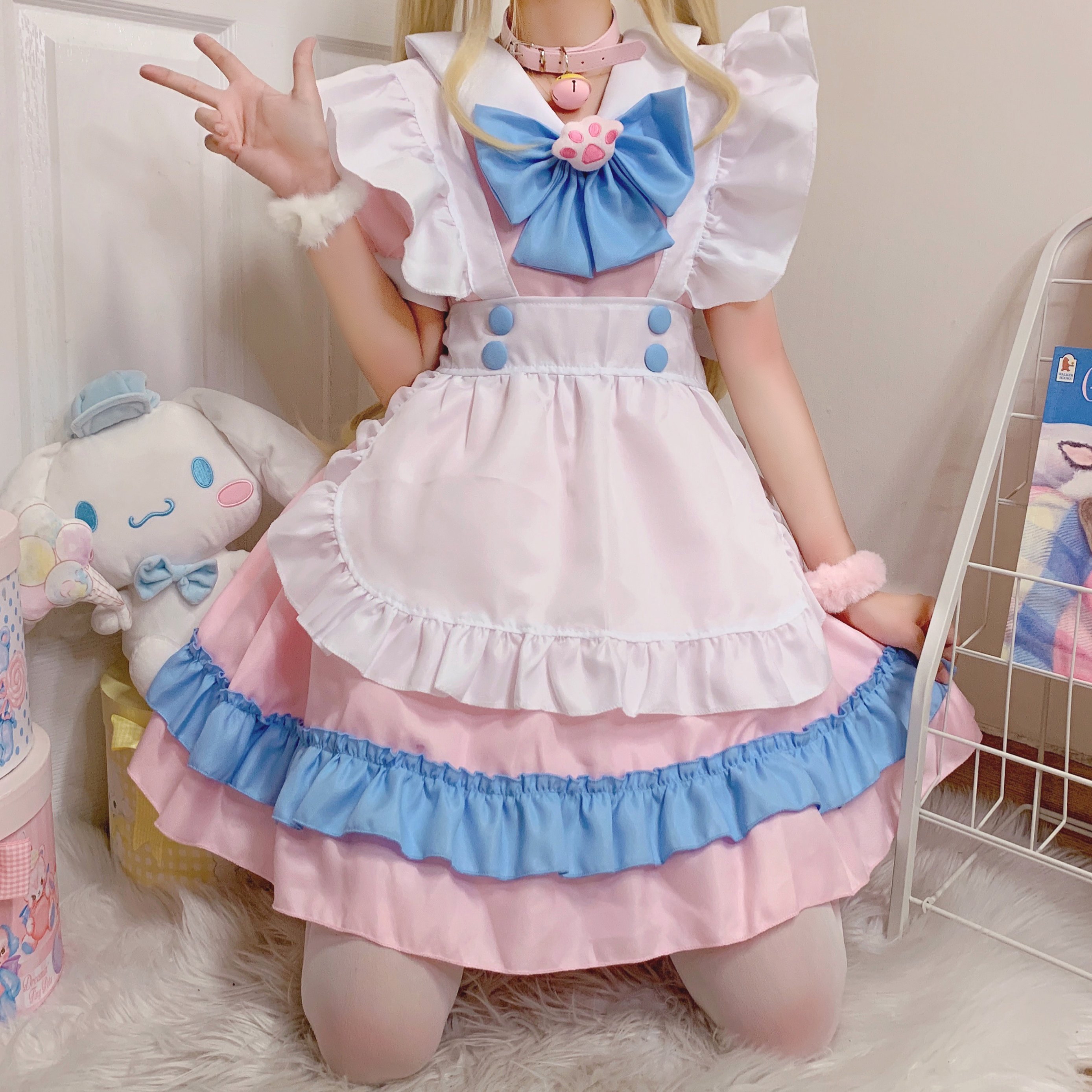 Plus Size Women Japanese Spring Summer Cute Sweet Soft Girl Cosplay Cat Neko Claw Bow White Apron Blue Pink Maid Dress
