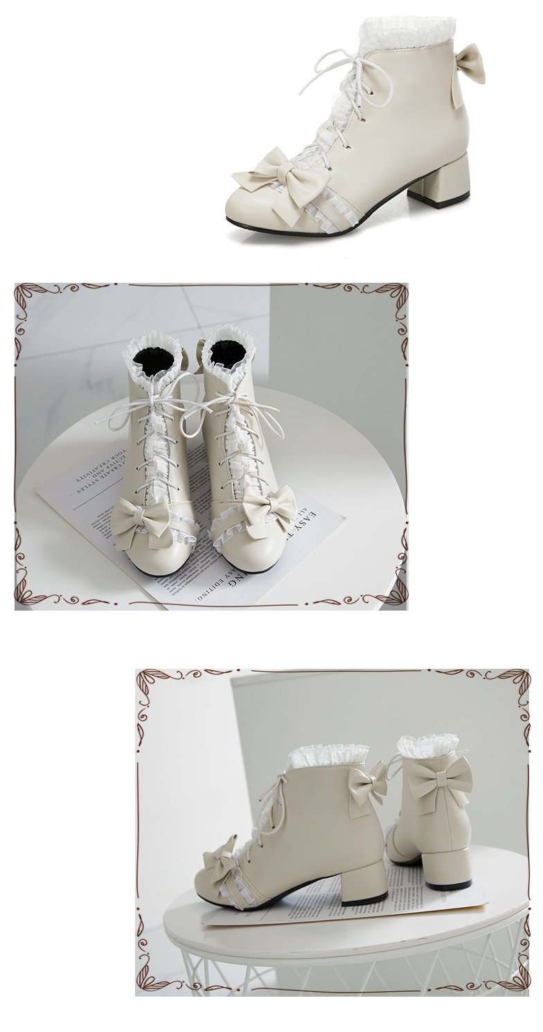 Japanese Sweet Princess Fairy Girl Bow Lace White Cream Pink High Heels Boots
