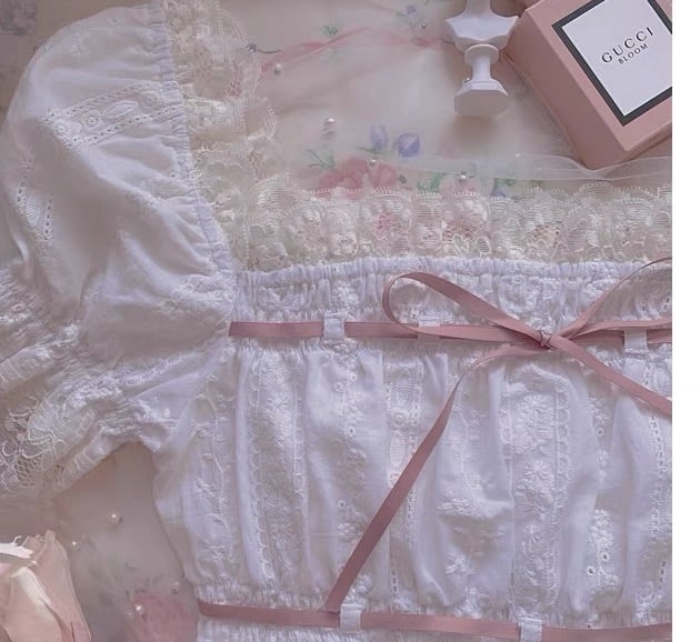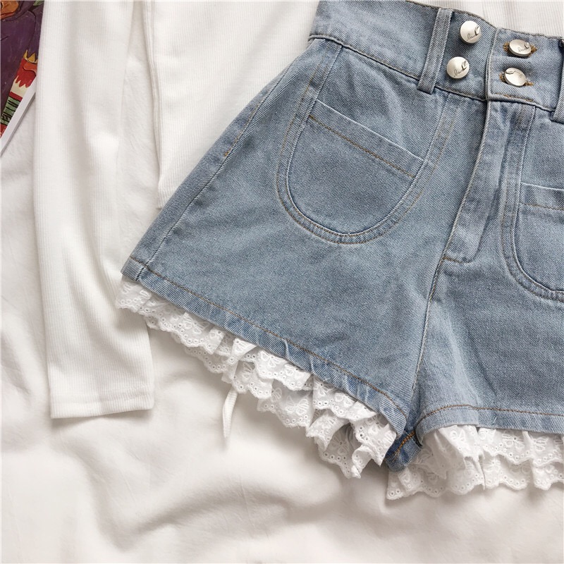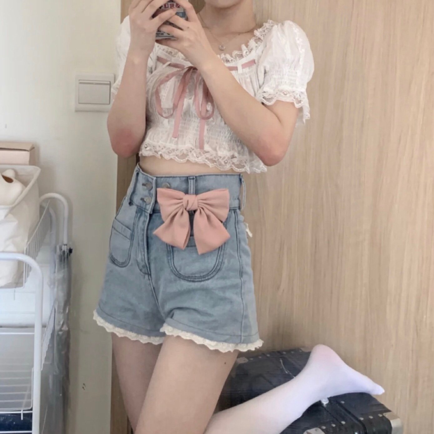 Angel Kiss French Doll Girl Summer Vintage Classic Lace Pink Ribbon White Top Blouse & Bow Denim Short Pants