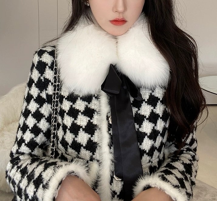 Classic Women French European Autumn Fall Winter Fashion Luxury Houndstooth Fur Collar White Black Pattern Jacket Two piece Skirt
