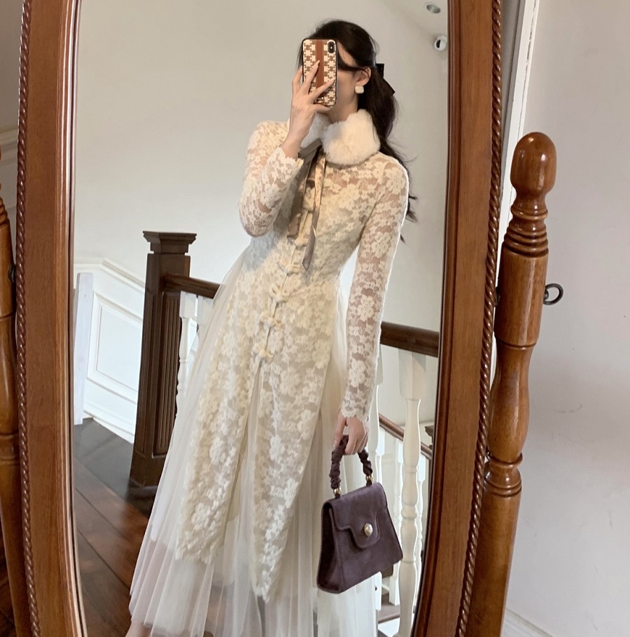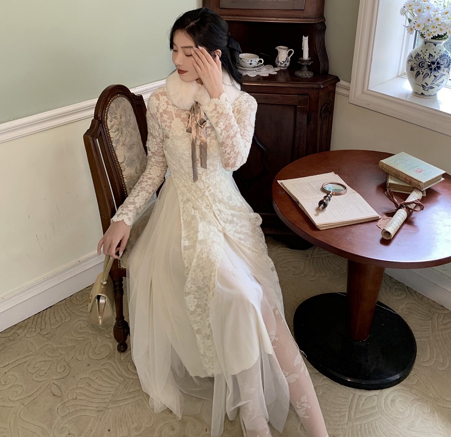 Romantic Classic Women French European Autumn Fall Winter Fashion Luxury Fur Collar Ribbon White Lace Layered Long Dress
