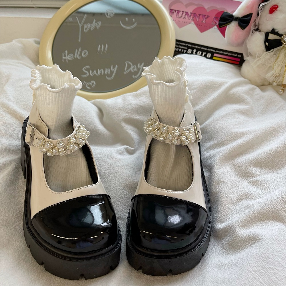 Japanese Cute Student Girl Spring Fall Autumn Pearl Fashion Mary Jane White Black High Heels Leather Shoes