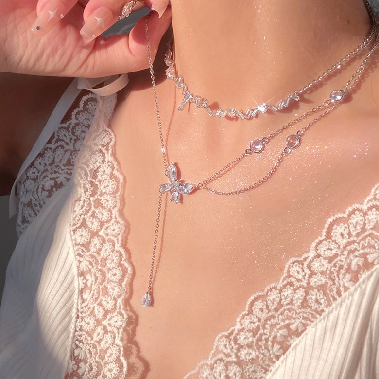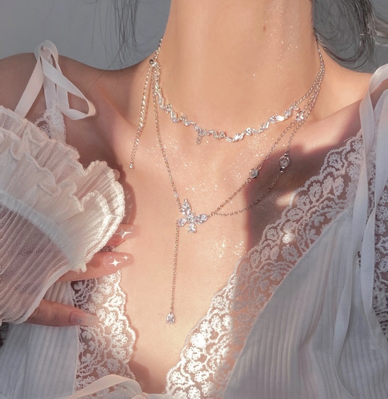Luxury Pretty Girl Butterfly Tassel & Water Drop Wave Silver Pendant Necklace