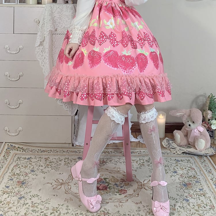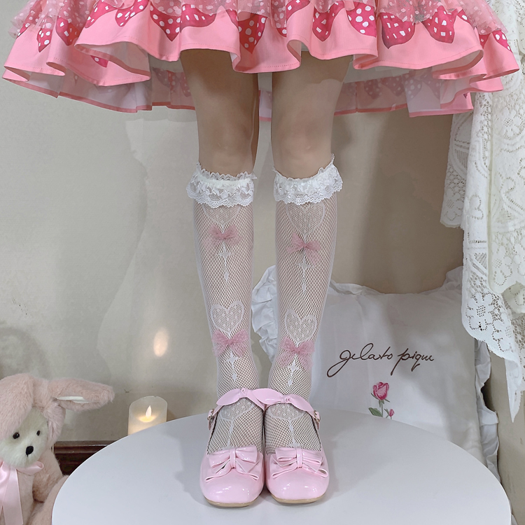 Japanese Sweet Heart Cross Pink Ribbon Fishnet White Knee Socks