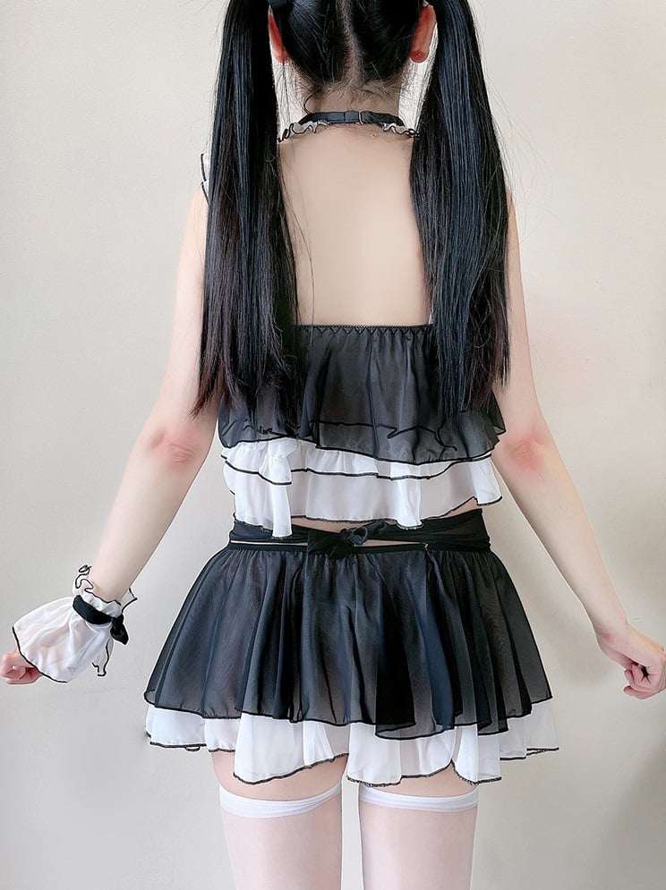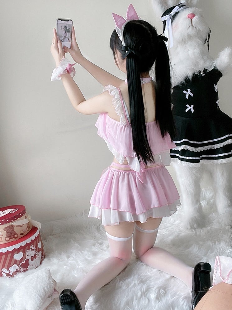 5 Pieces Sexy Maid Cat Girl Cosplay Pink & Black Lingerie Tops Skirt
