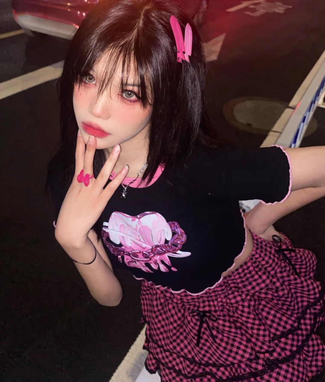 Japanese Harajuku Cyberpunk Metal Pink Silver Heart Love Emo Girl Embroidery Design Cool Chic Print Vest High Short Sleeve Top T Shirt