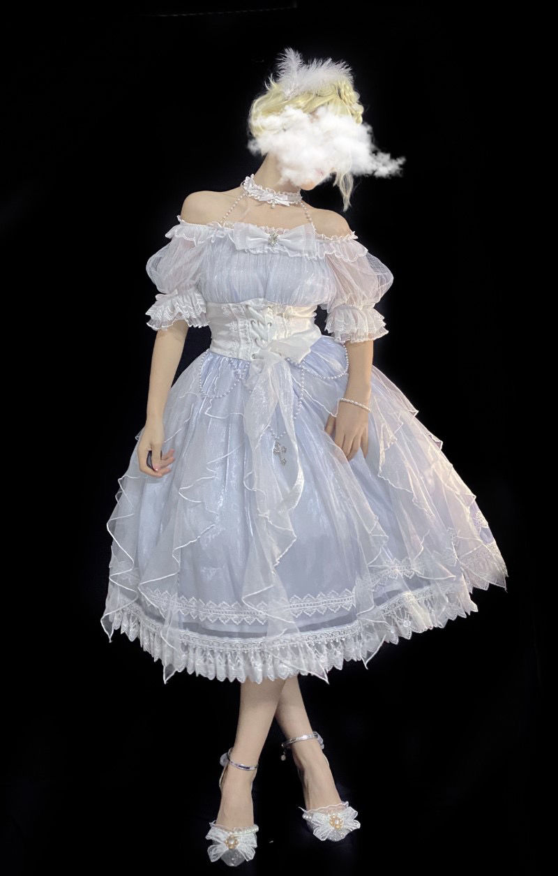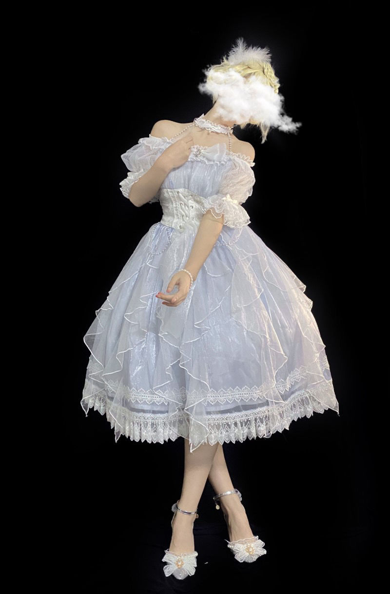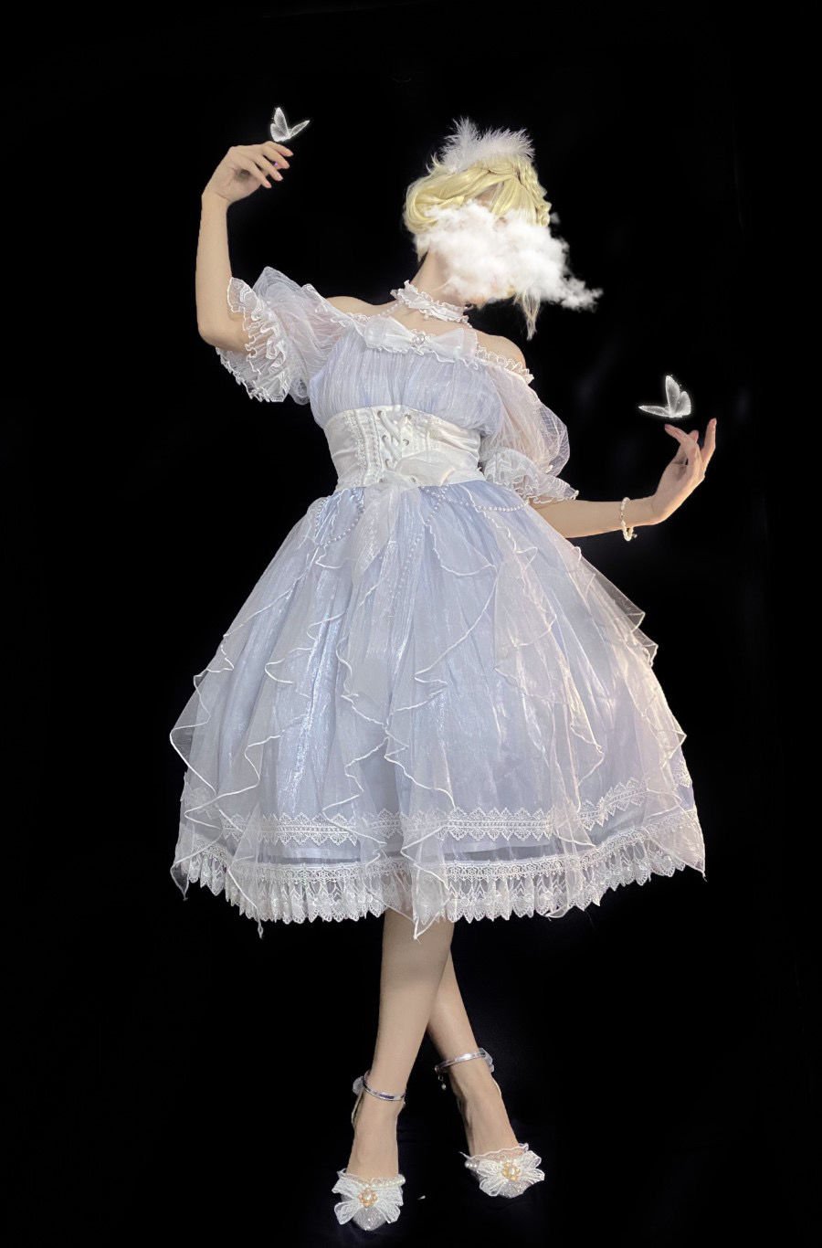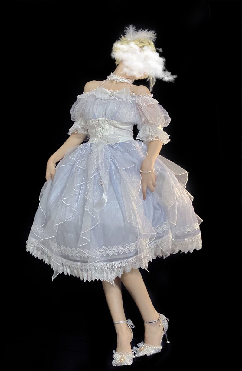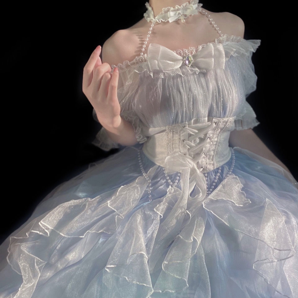 Japanese Princess Doll Fairy Cinderella Layered Lace Pearl Bow Blue White Dress