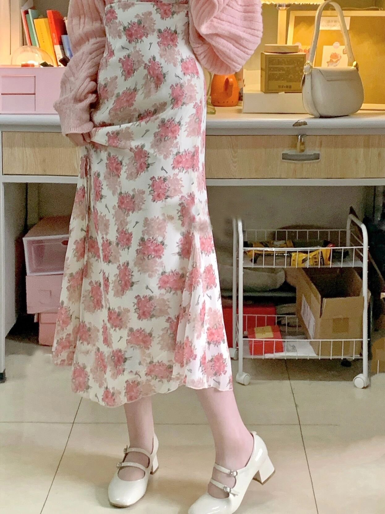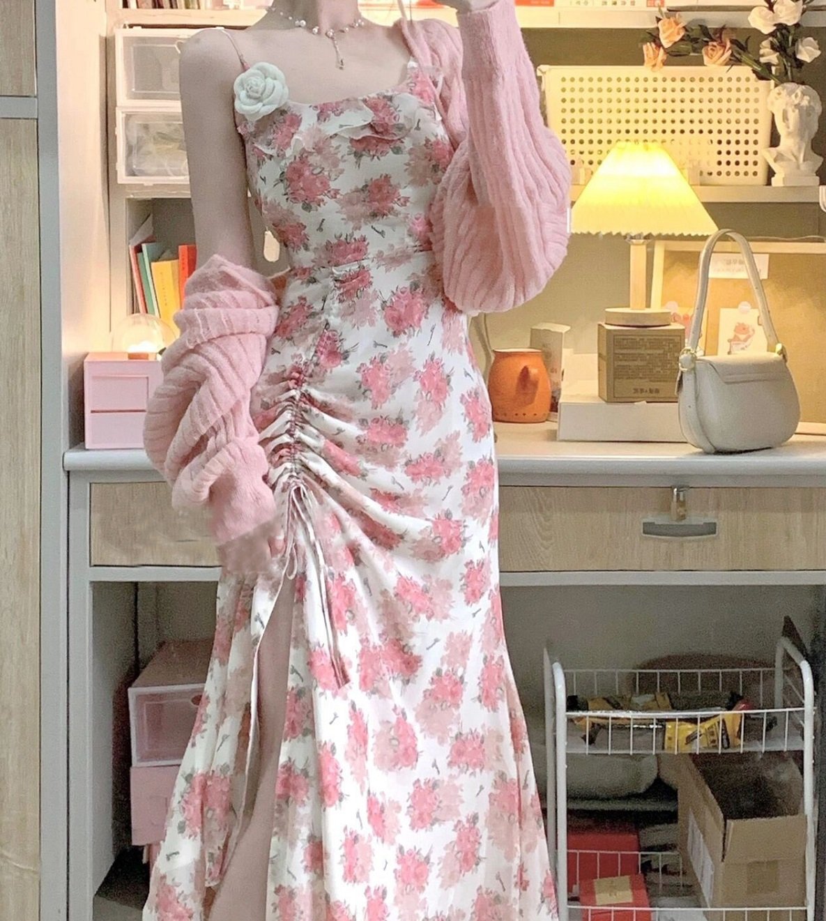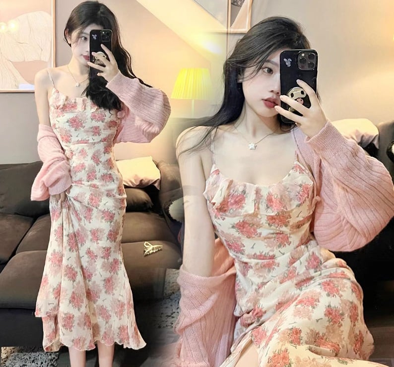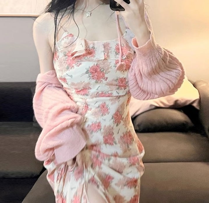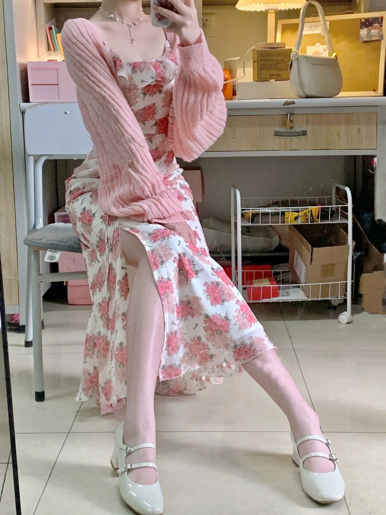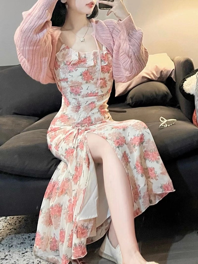 European French Fashion Sexy Sweet Cute Girl Women Elegant Classic Flower Floral Pink Sweater Knit Cardigan Long Layered Strap Dress Set