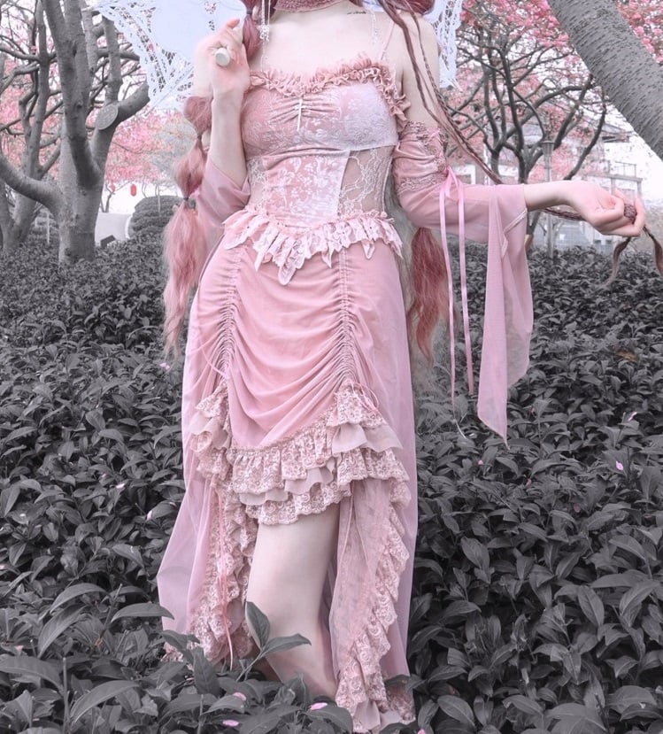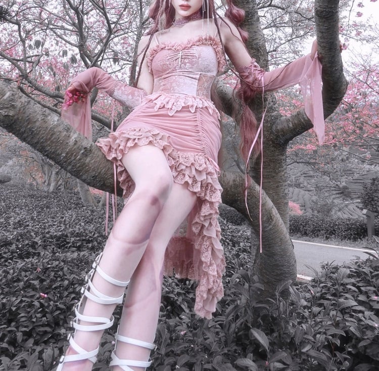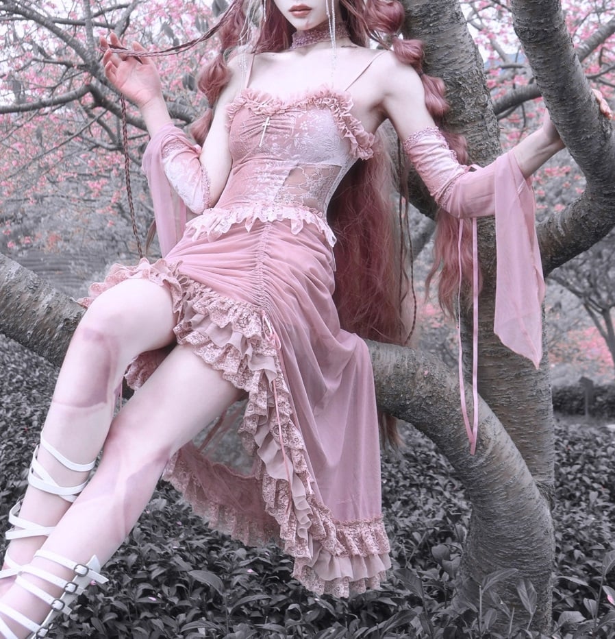 Guardian of Sakura Tress Gothic Lace Velvet Pink Suspender Dress