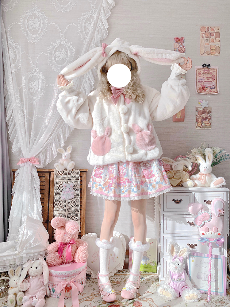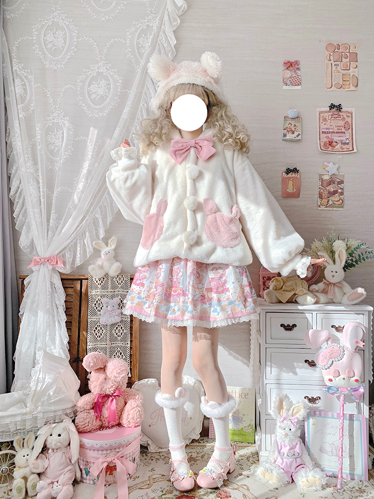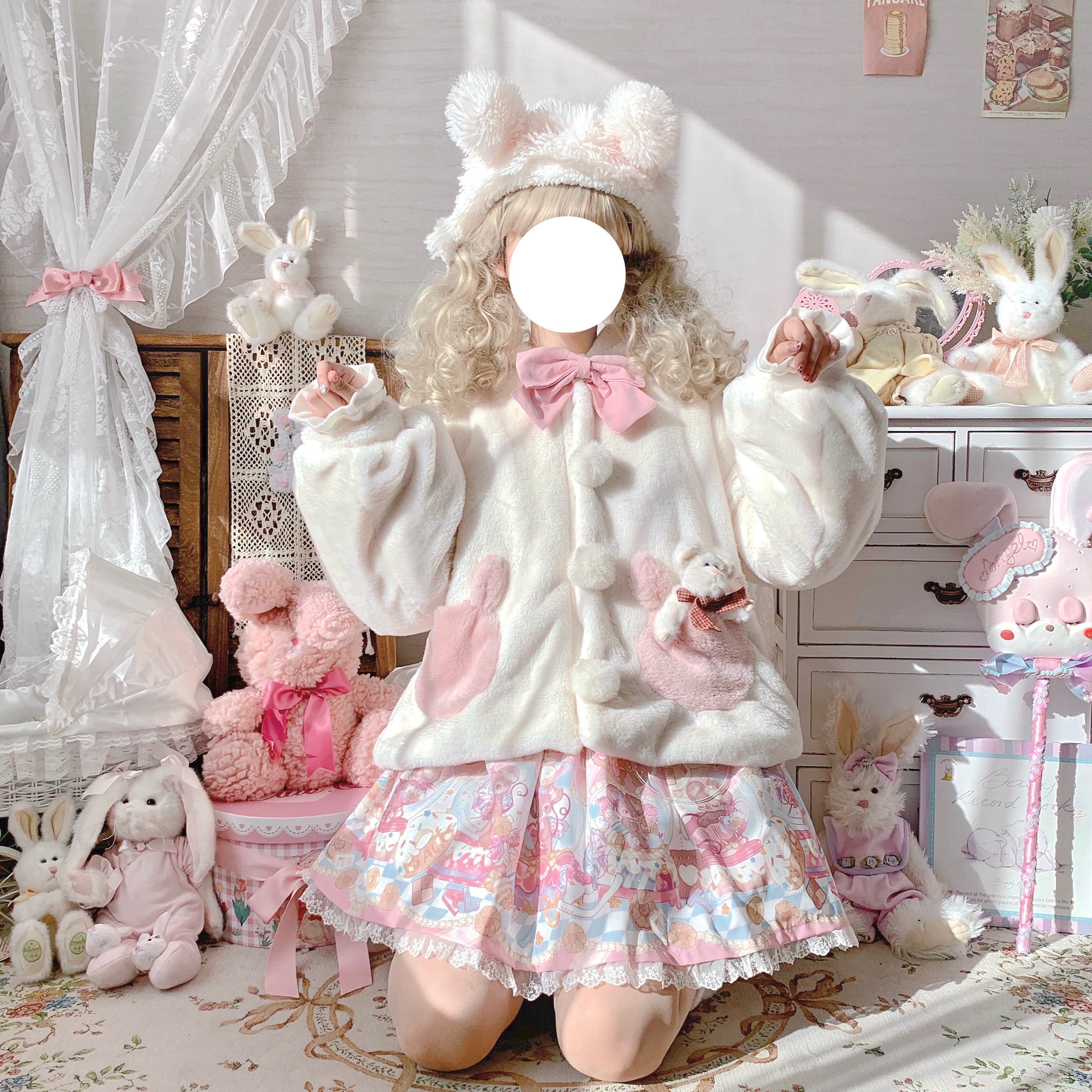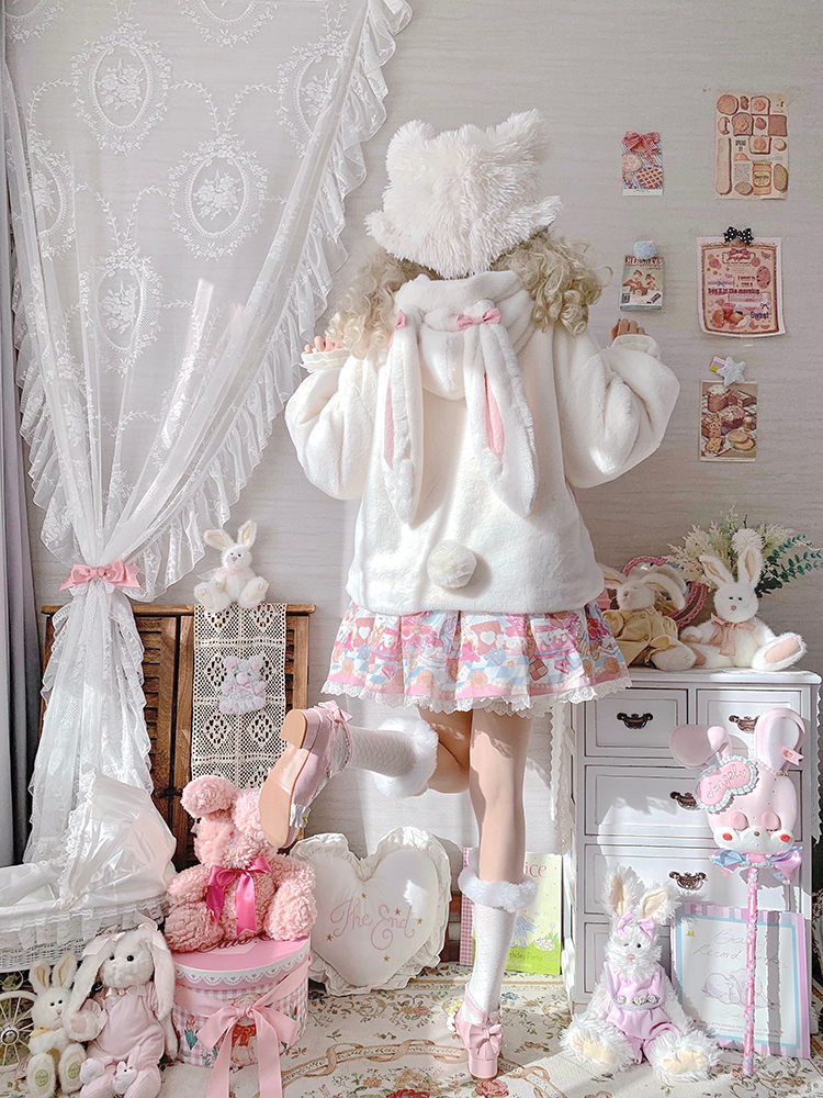 Cute Fluffly Rabbit Bunny Ears Plush Thick Warm Winter White & Pink Coats Jackets