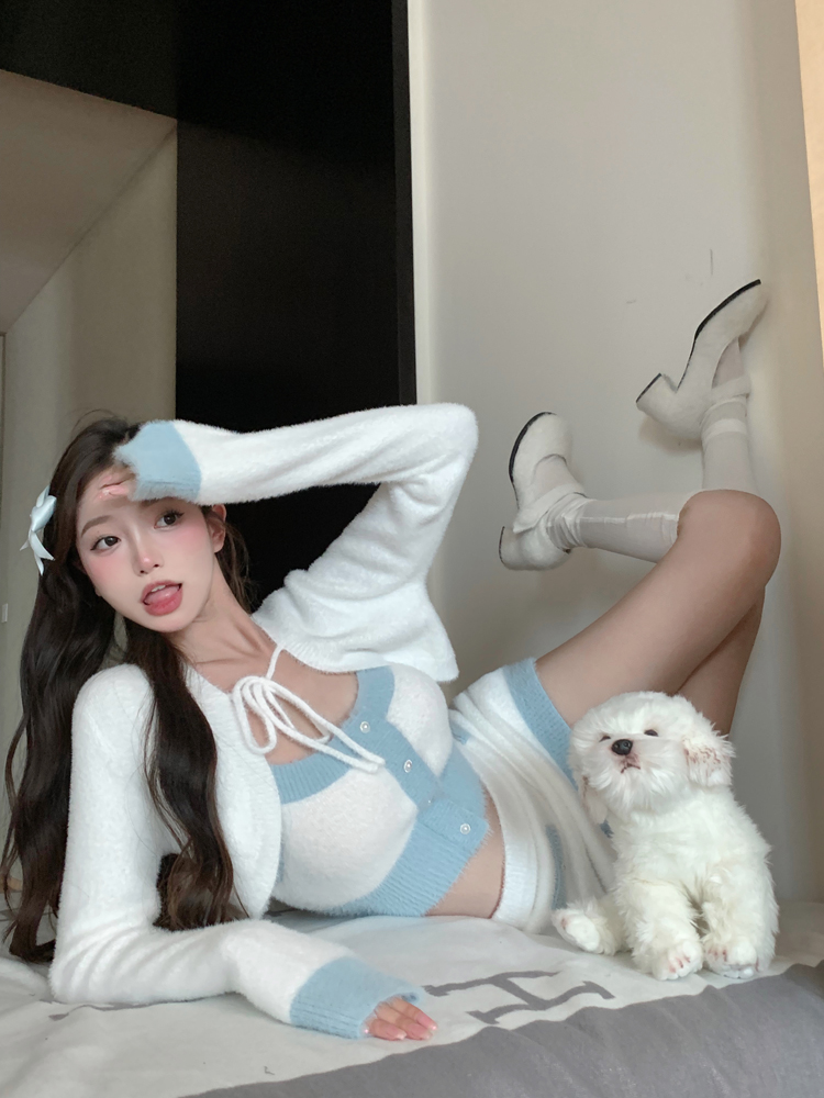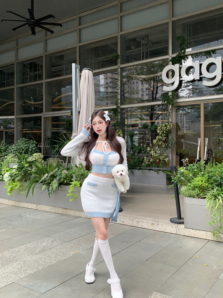 Knit Embroidery Fashion Chic Girl Korean Pastel Baby White Blue Camisole Top Long Sleeve Cardigan Skirt Three Piece Set