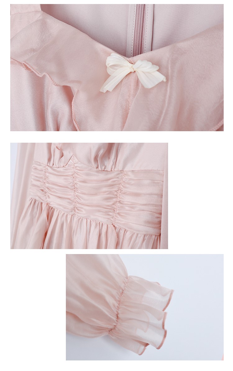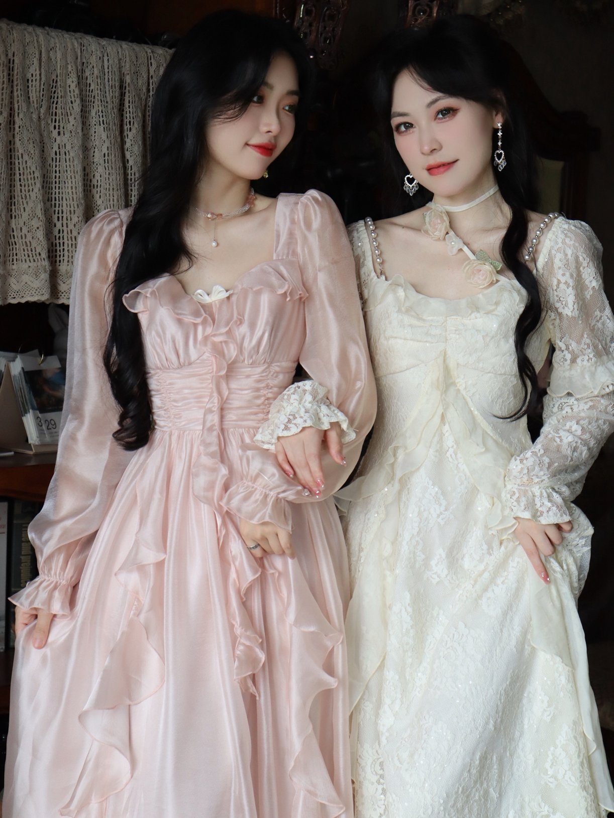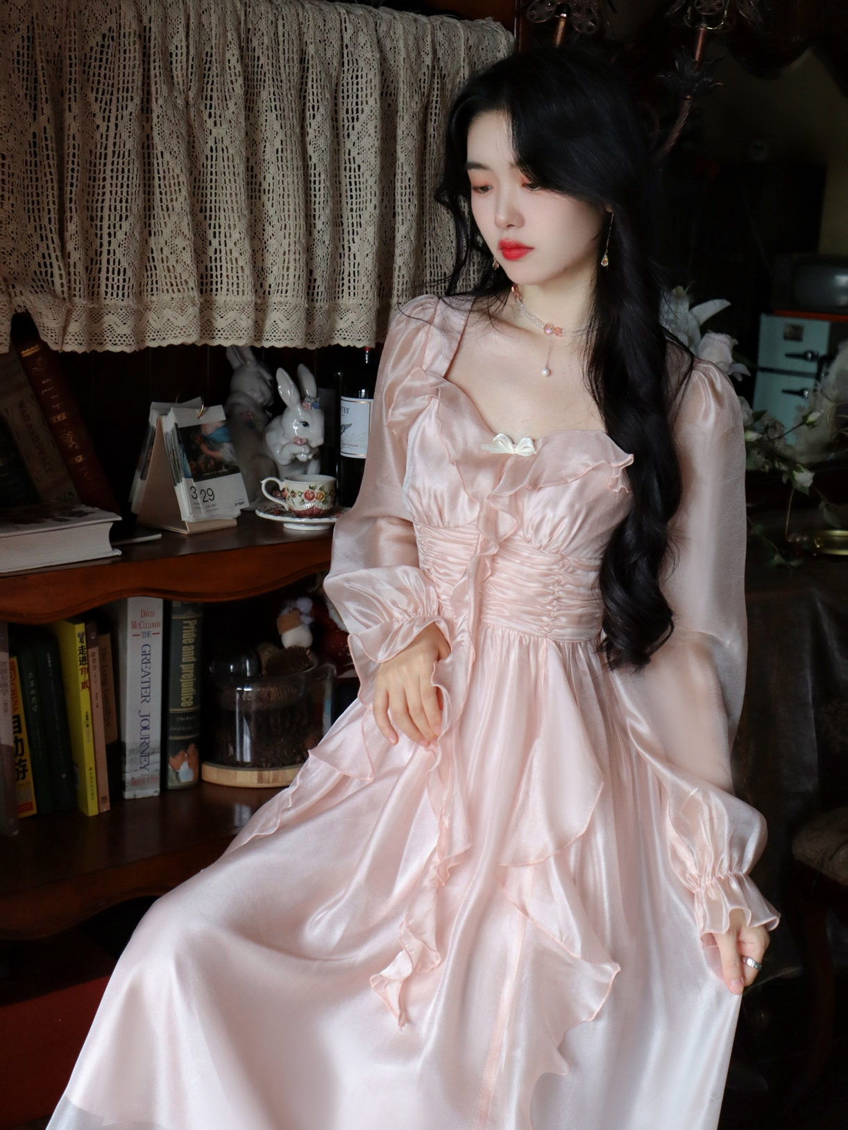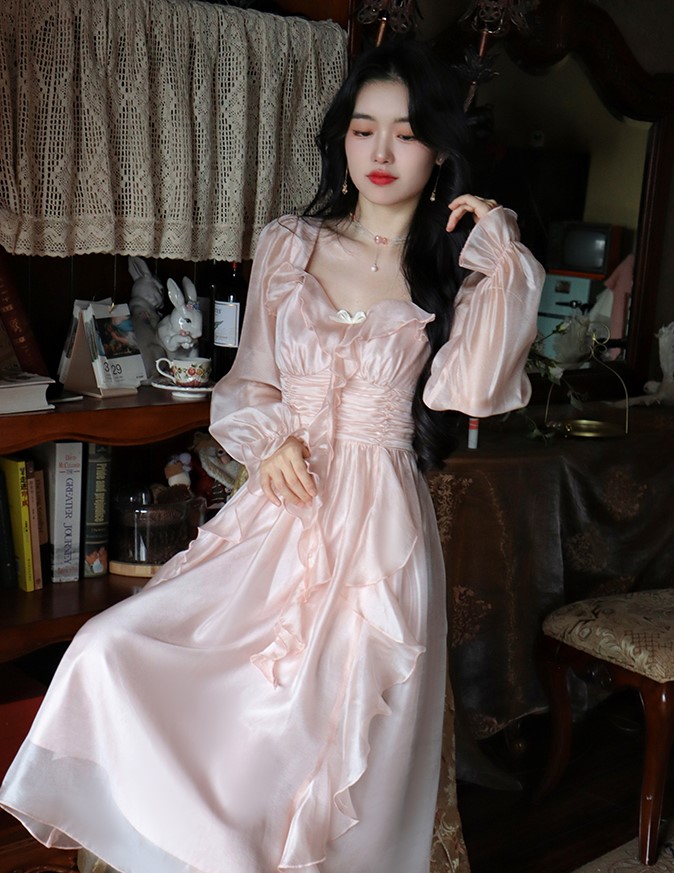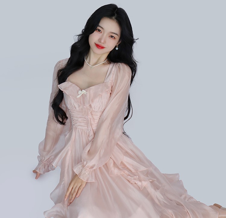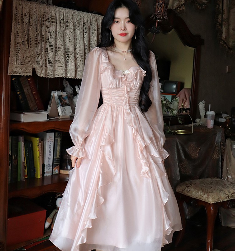 French European Women Girl Fashion Style Elegant Luxury Spring Autumn Winter Ruffled Flower Floral Princess Fairytale Transparent Long Pink Dress