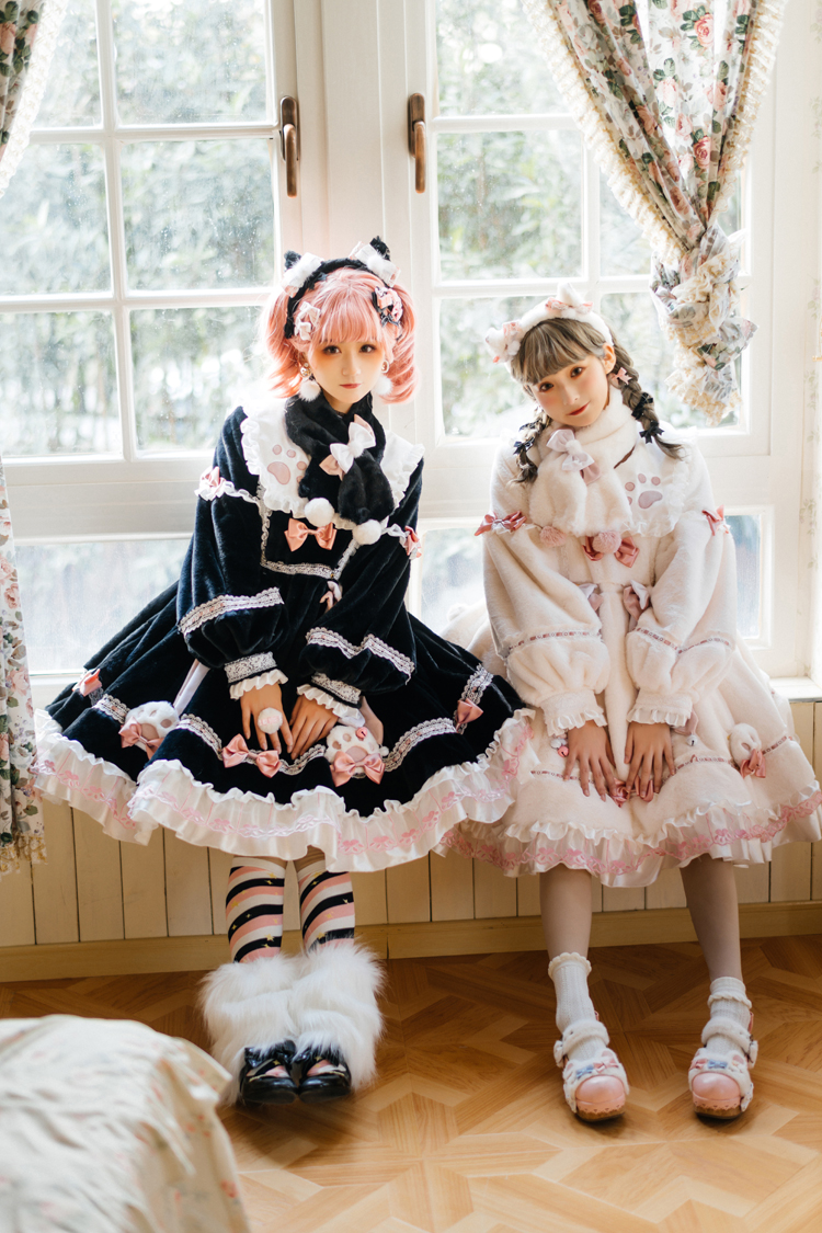 Japanese Winter Warm Plush Thick Paw Print Bow Lace Pink Black White Dress