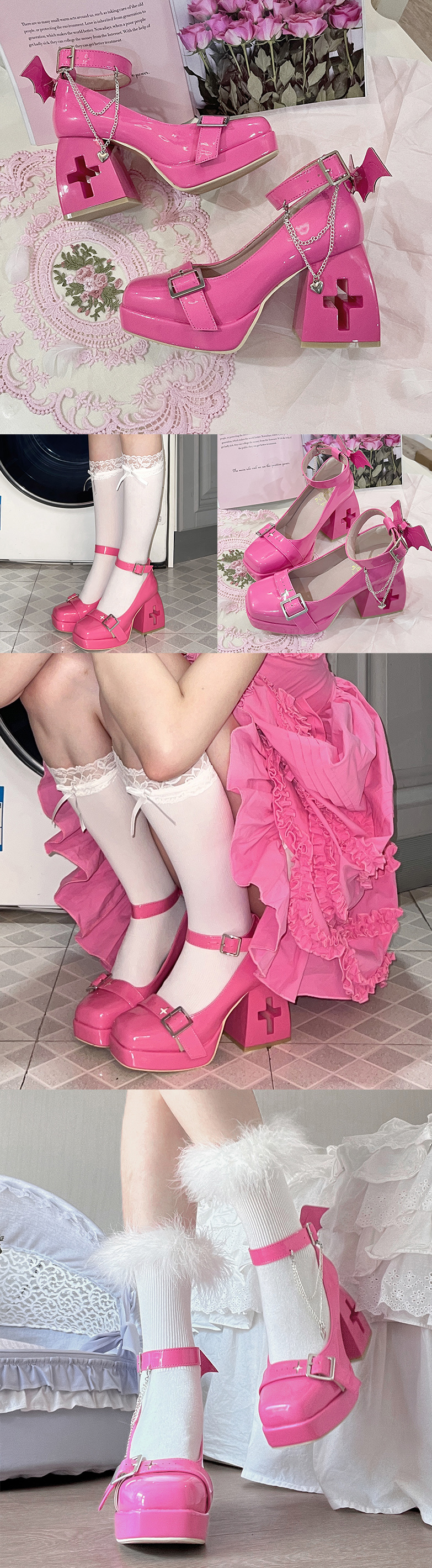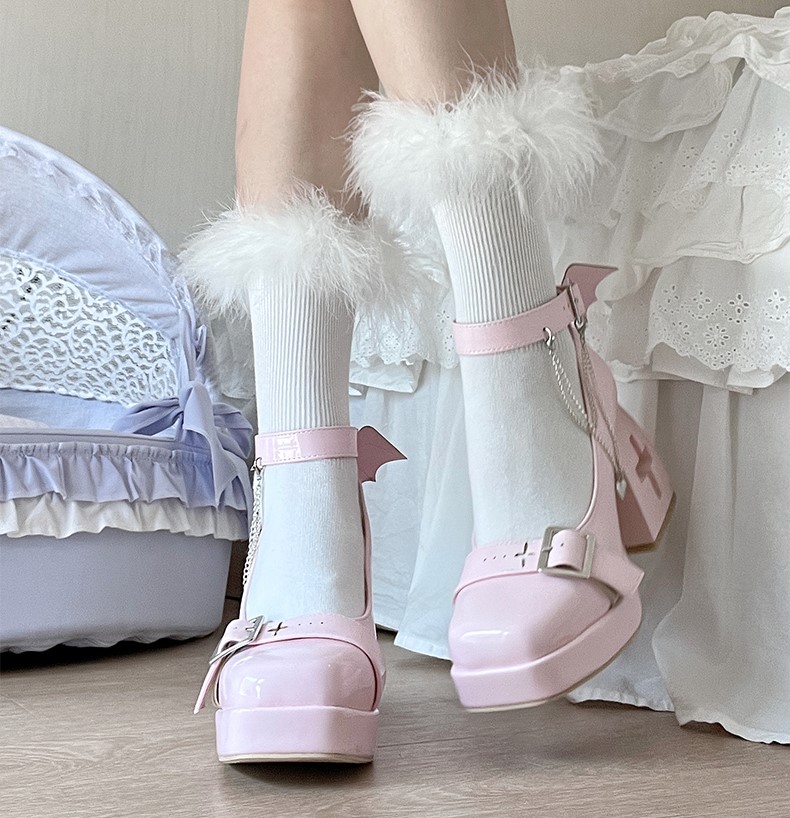 Punk Devil Wings Cross Heart Silver Chains Japanese High Heels Mary Jane Shoes