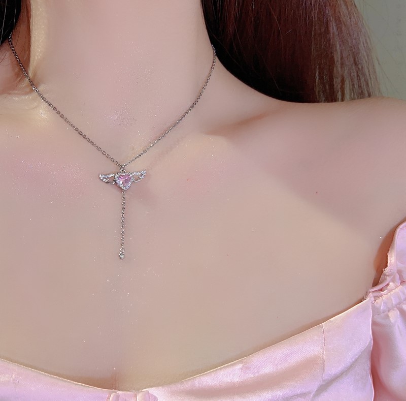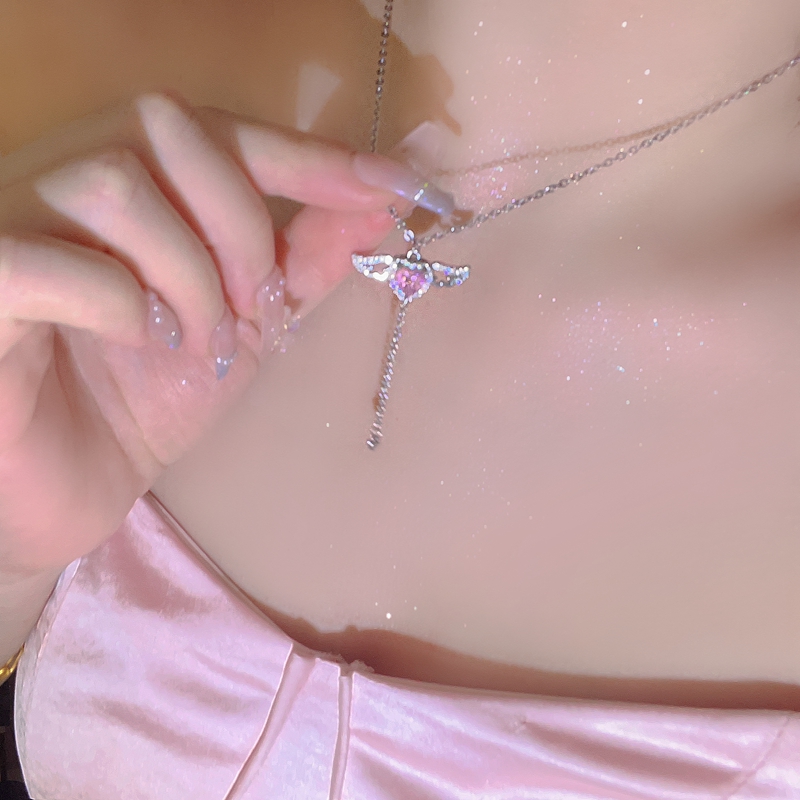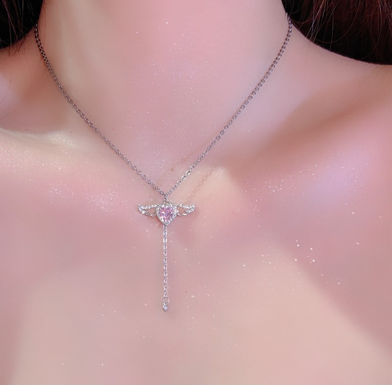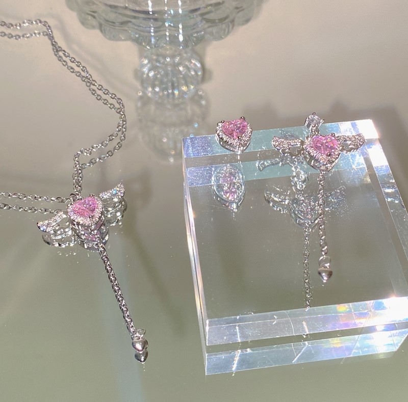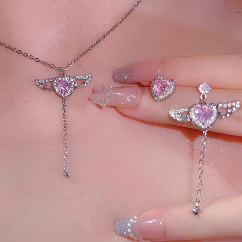 Angelic Luxury Girl Moving Wings Pink Diamond Heart Gift Earrings Necklaces Pendants Set