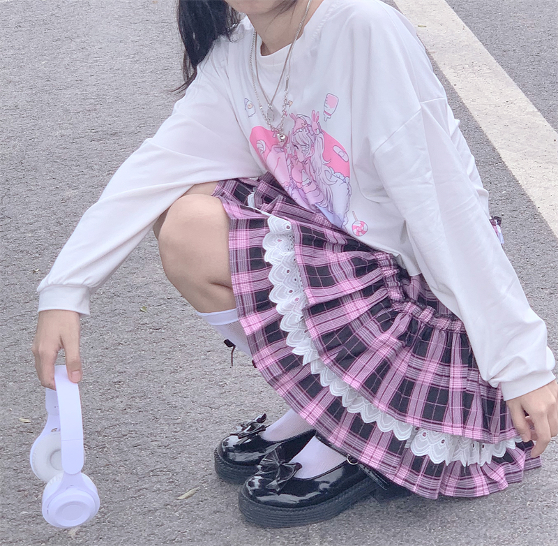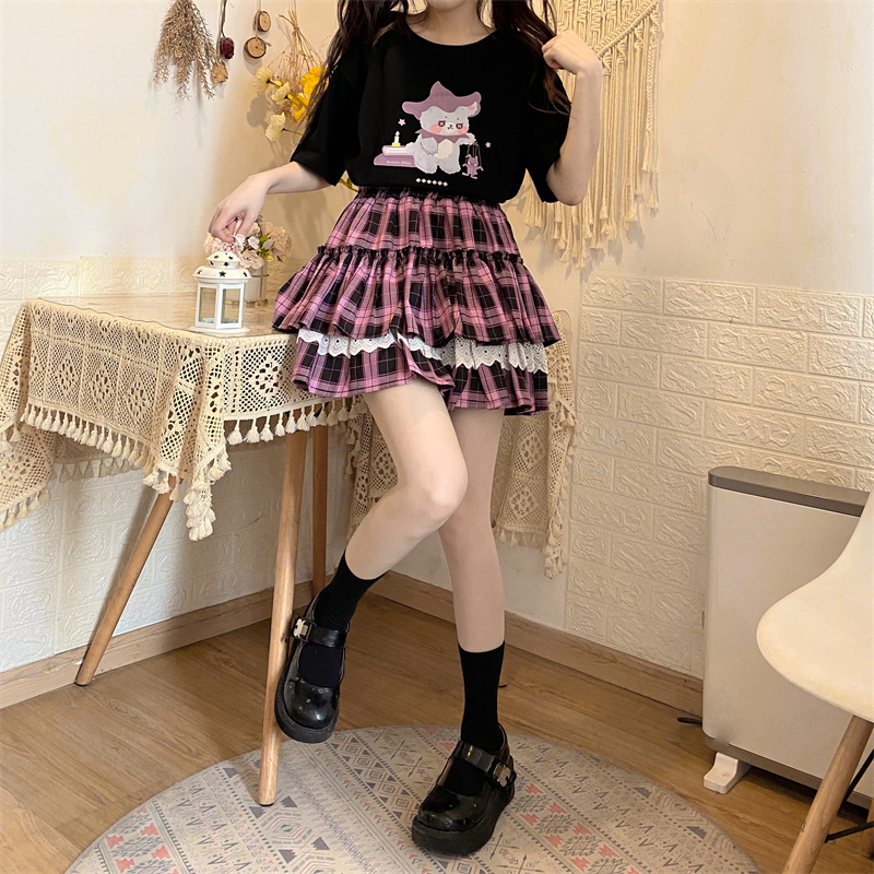 Goth Gothic Girl Black Pink White Plaid Layered Lace Mini Short Skirt