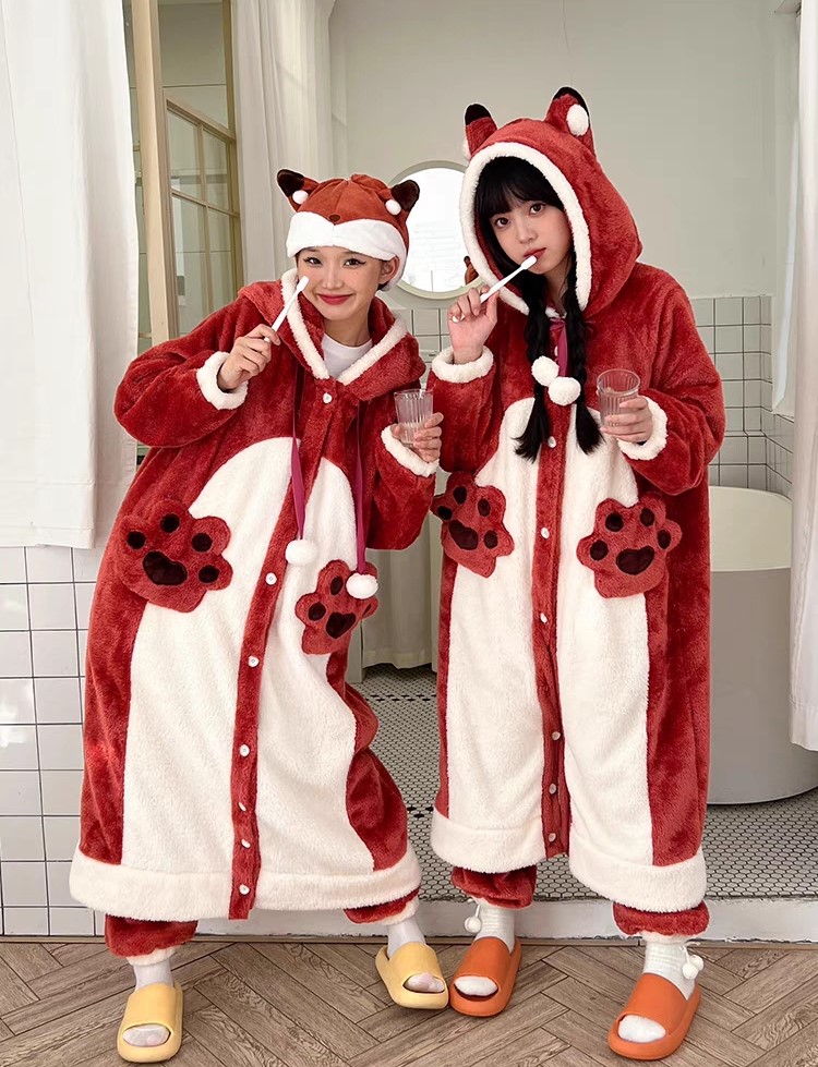 Winter Thick Warm Soft Cute Little Red Fox Ears Hoodies Nightgown Long Coat Pants Pajamas Two Piece Set
