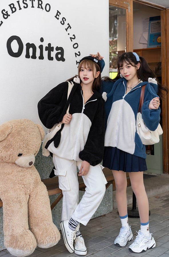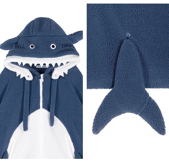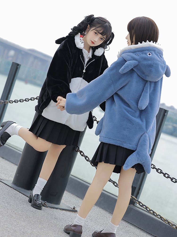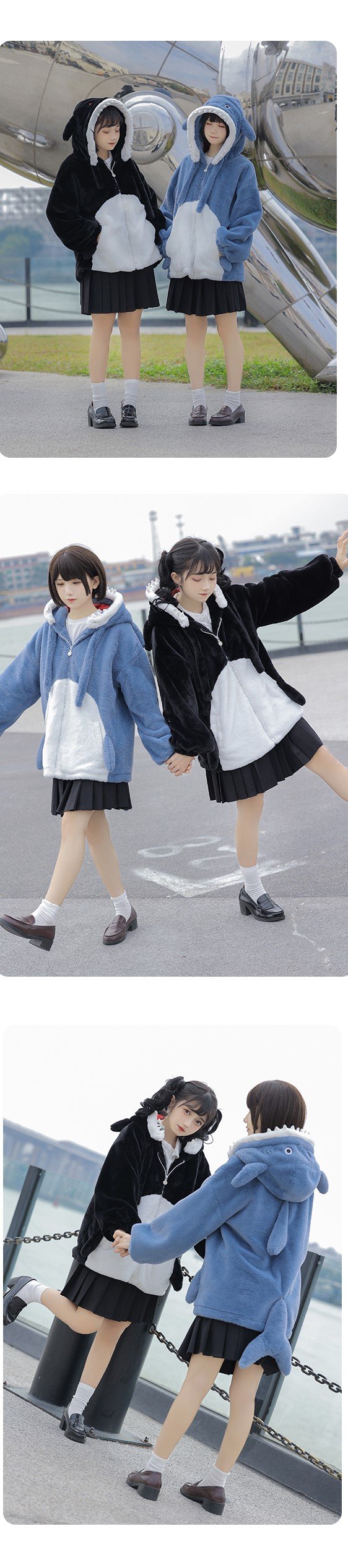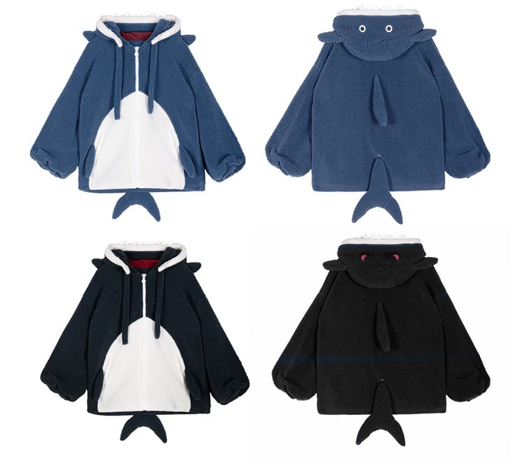 Japanese Girl Cute Cartoon Cozy Black & Blue Shark Tail Zipper Cashmere Wool Hoodie Jacket