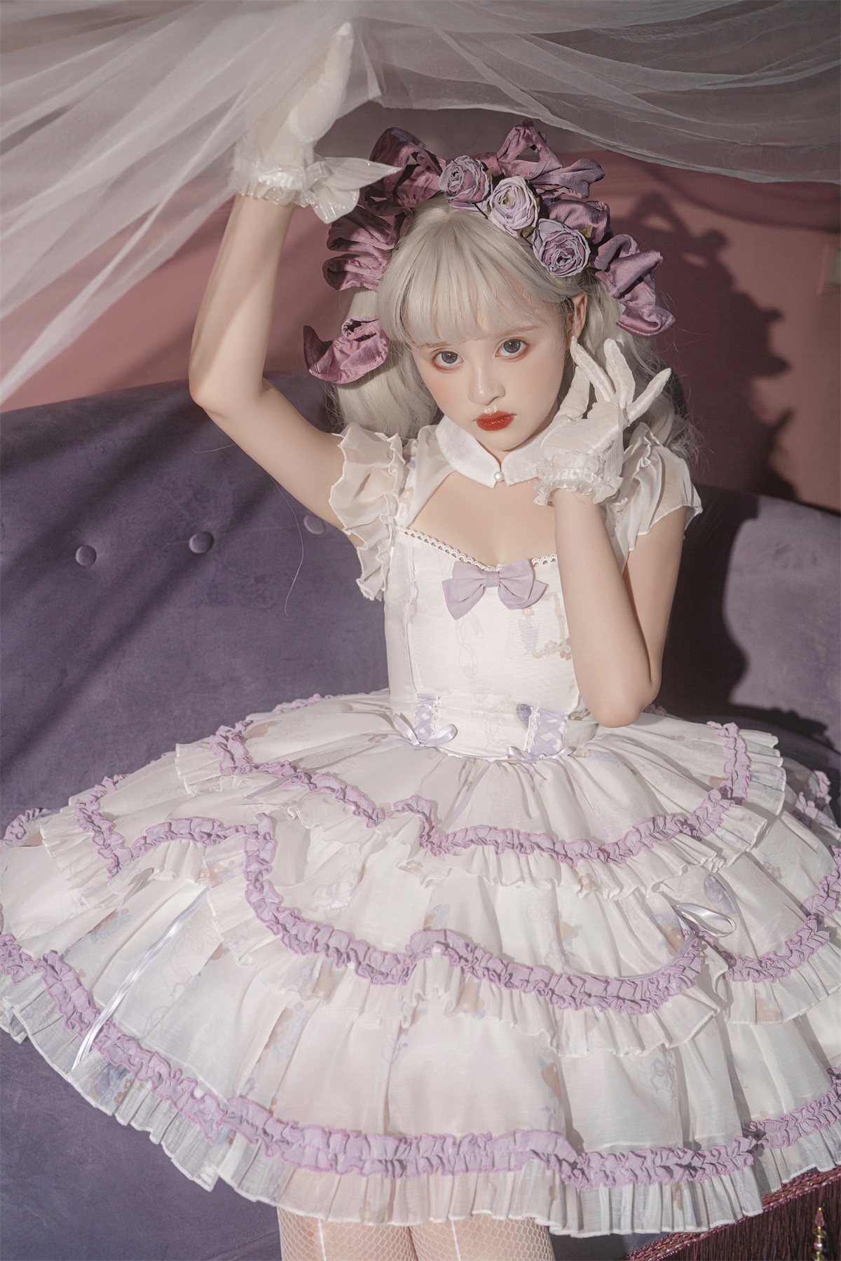 Black & White Violet Purple Rose Goth Girl Gothic Bow Lace Ruffled Layer Dress