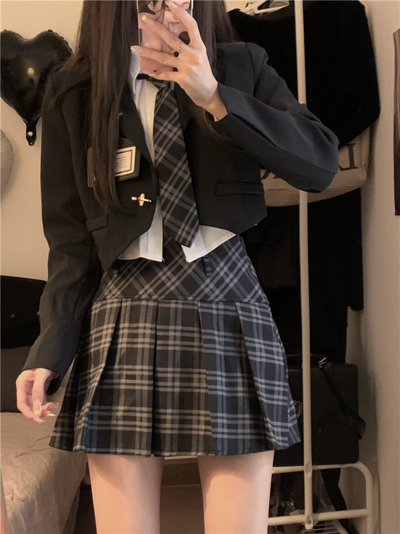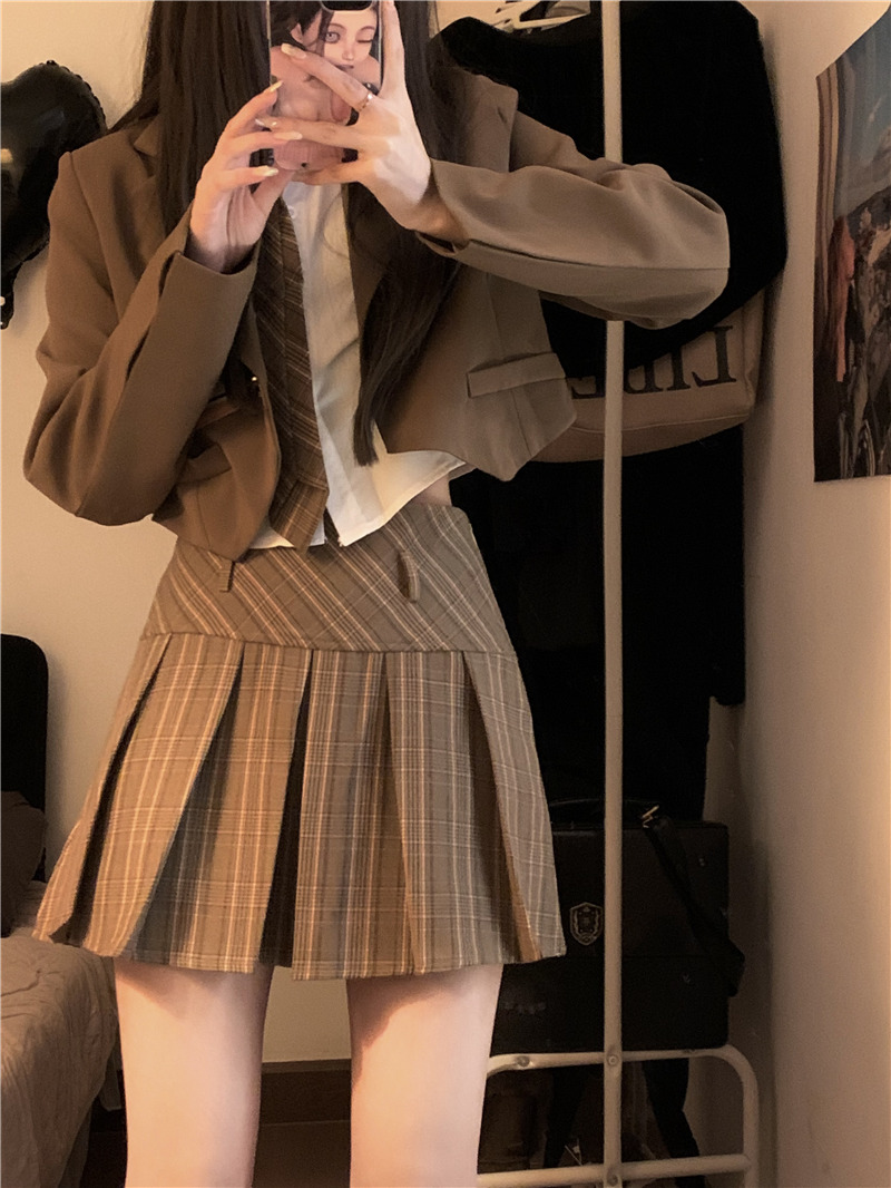 Dark Academia Classic Elegant Student Girl Sweet Autumn Brown & Black Suit Jacket Long Sleeve Shirt Plaid Pleated Skirt Three Piece Set