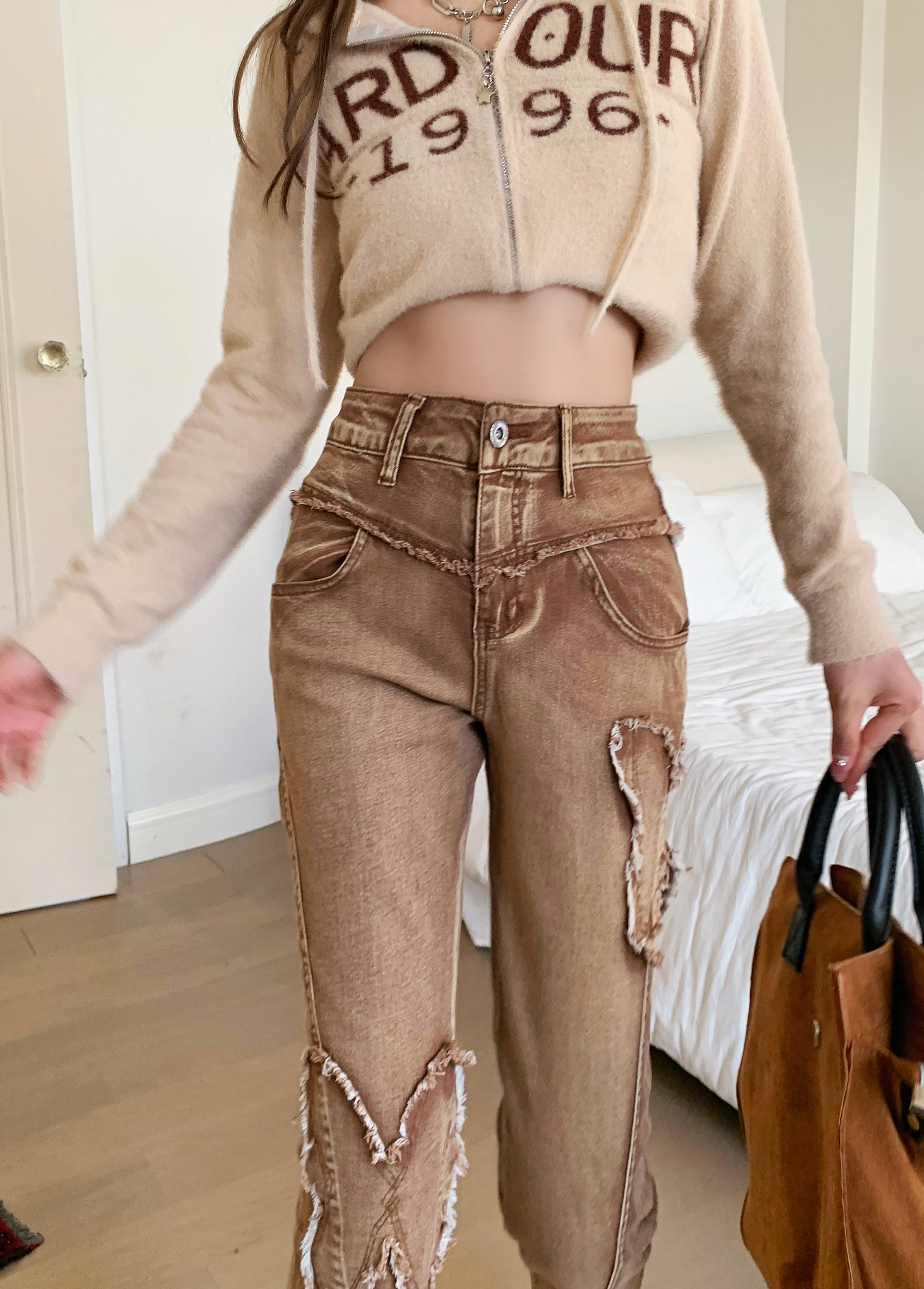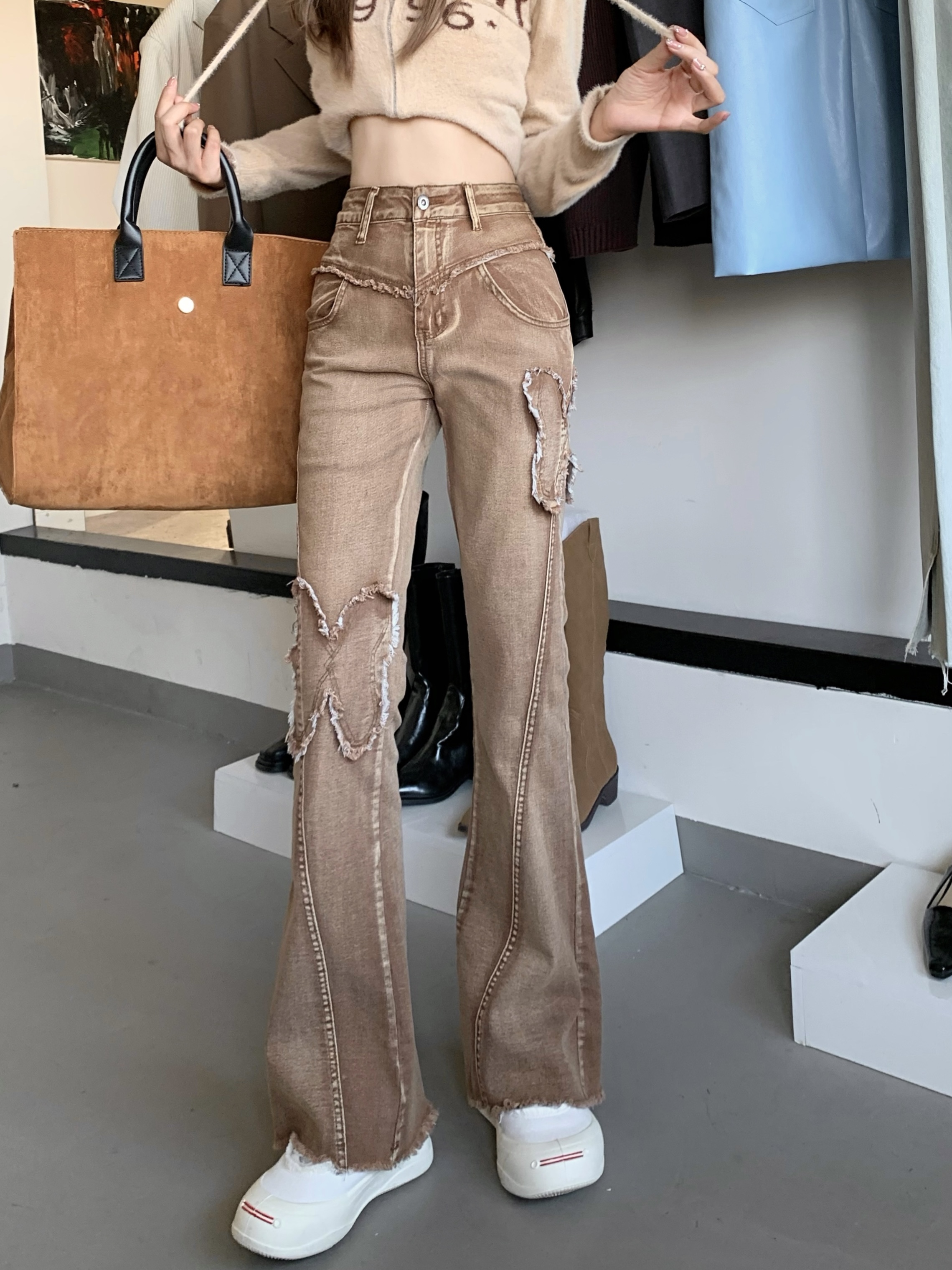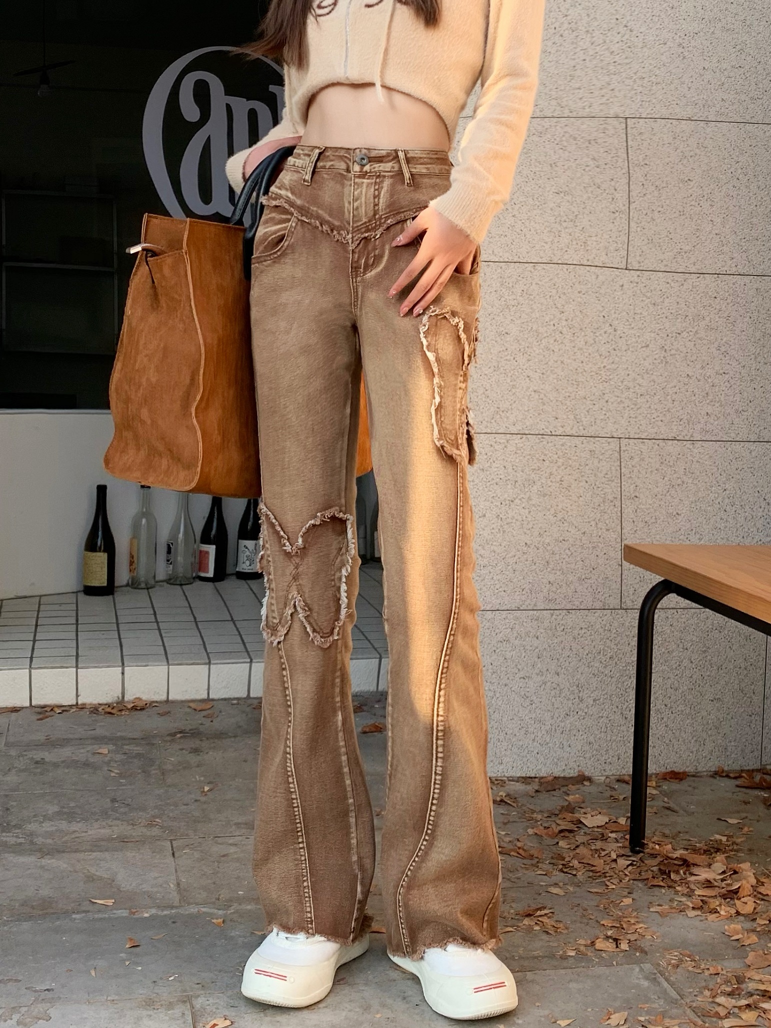 Street Fashion Cool Women Girl Retro Butterfly Brown High Waist Wide Leg Jeans