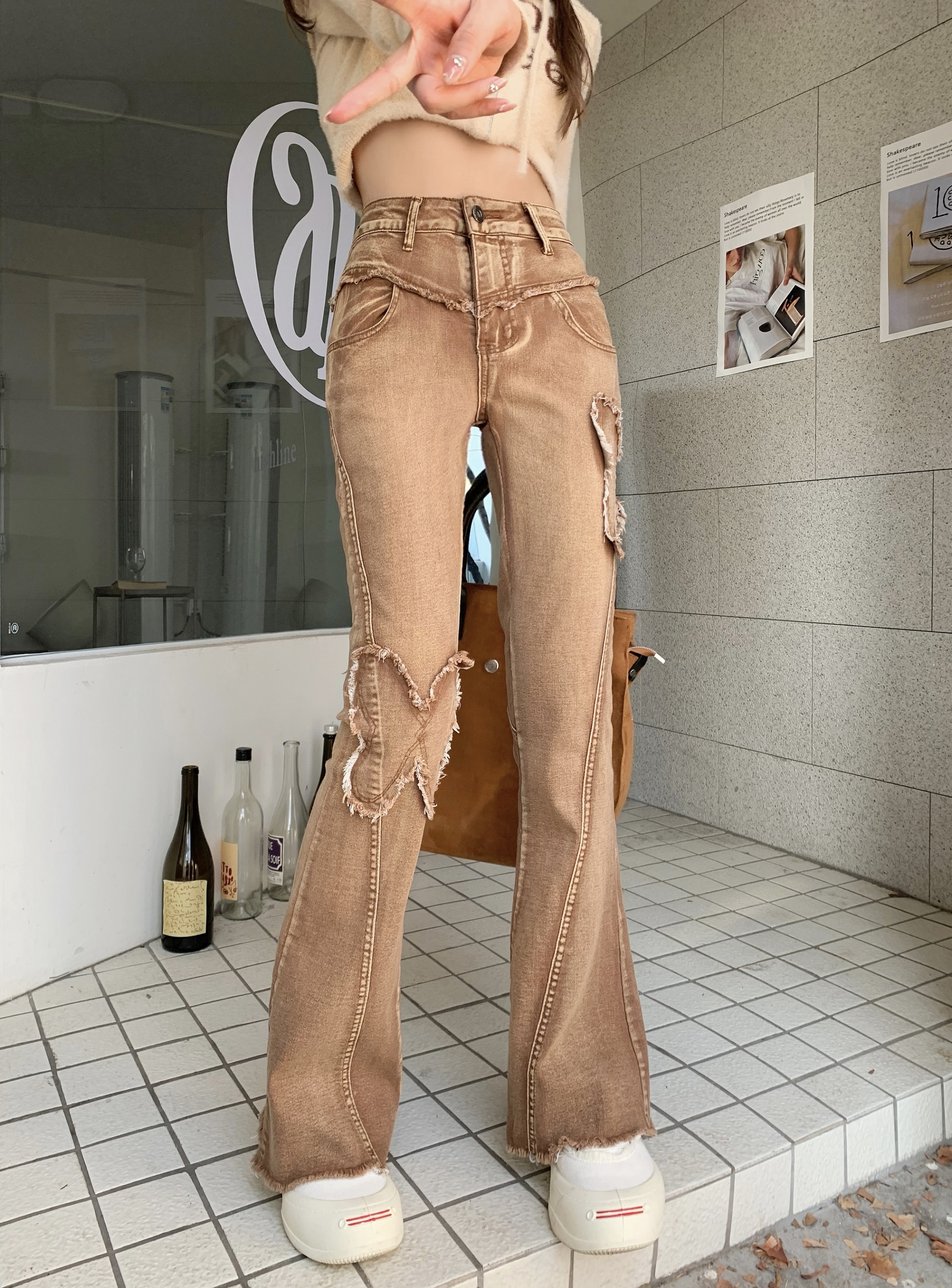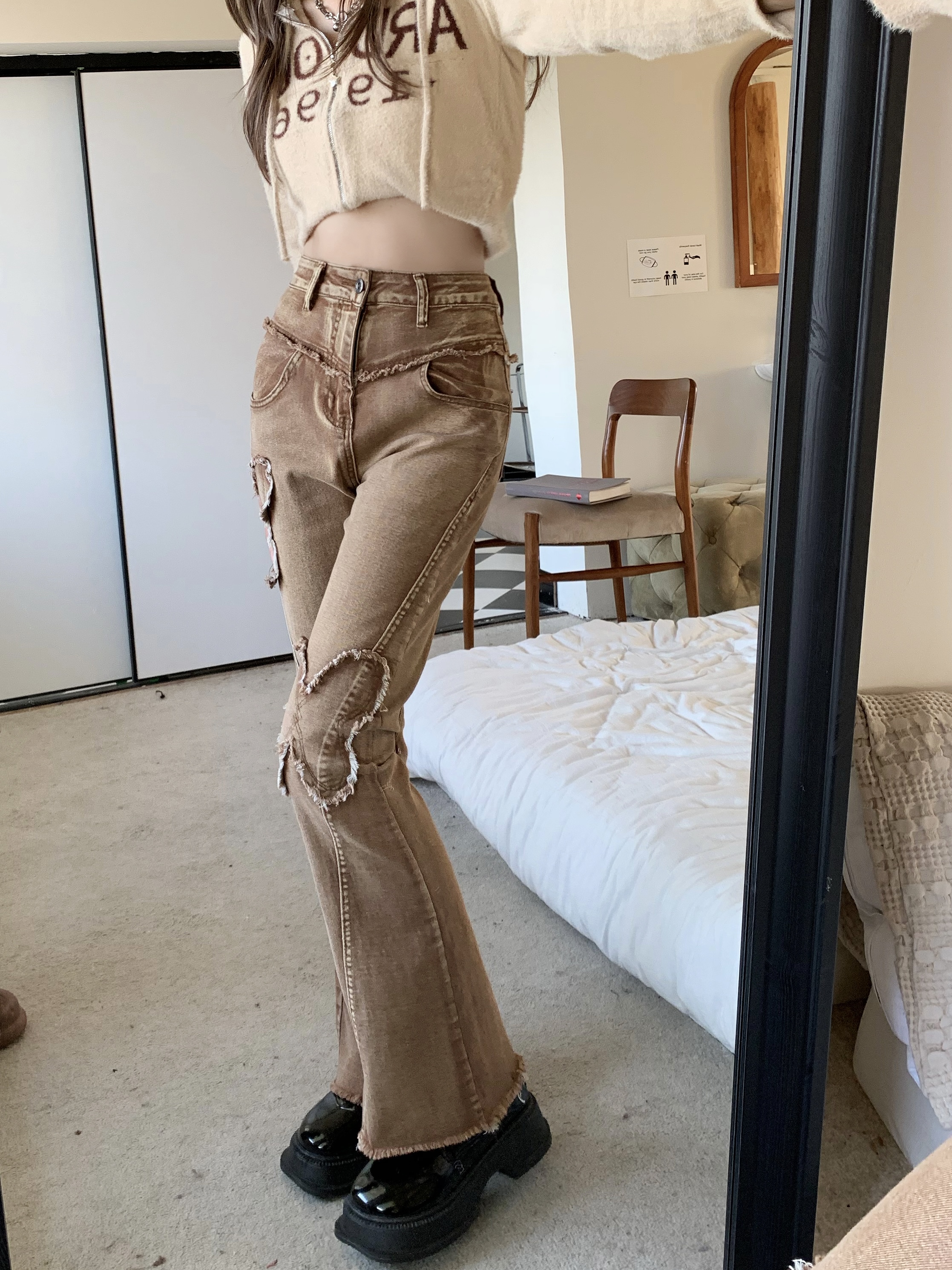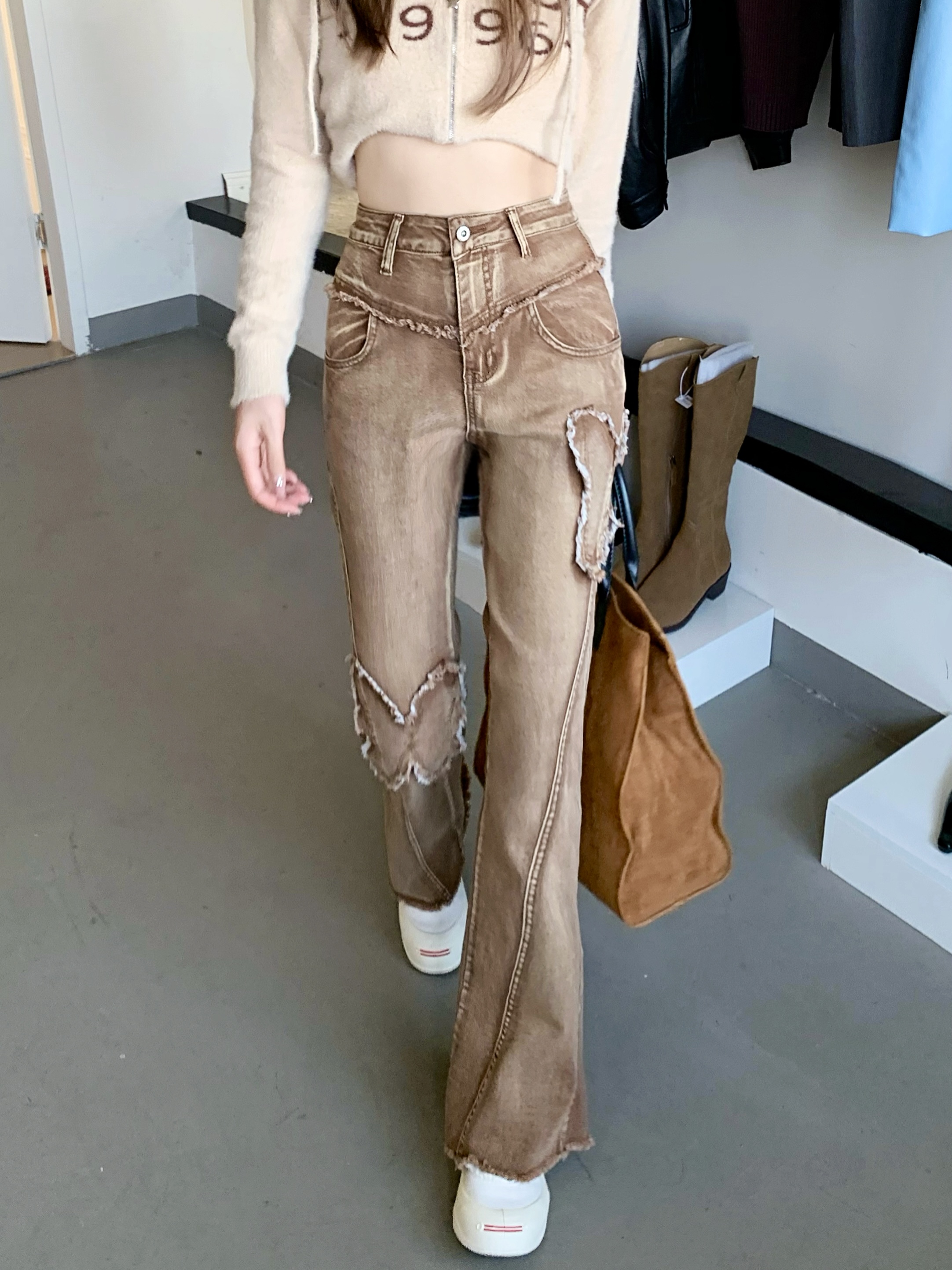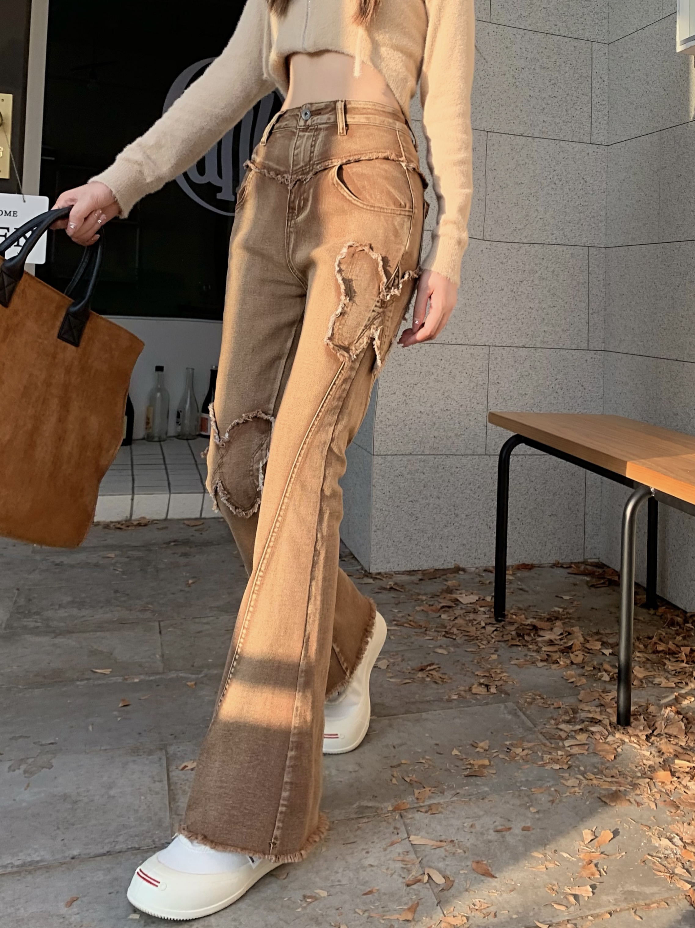 Street Fashion Cool Women Girl Retro Butterfly Brown High Waist Wide Leg Jeans