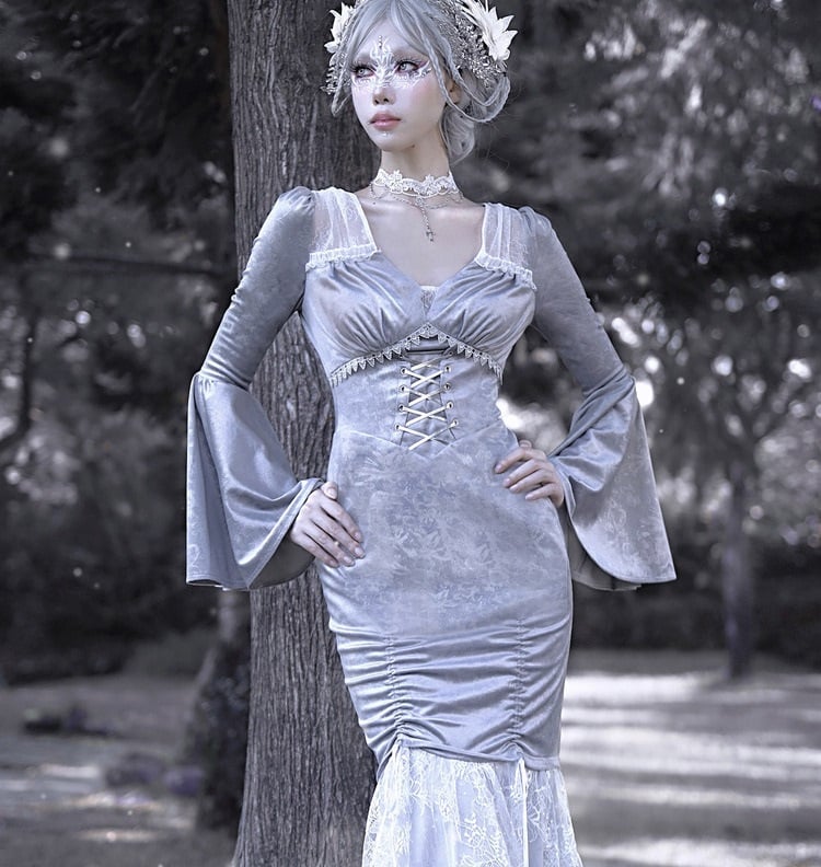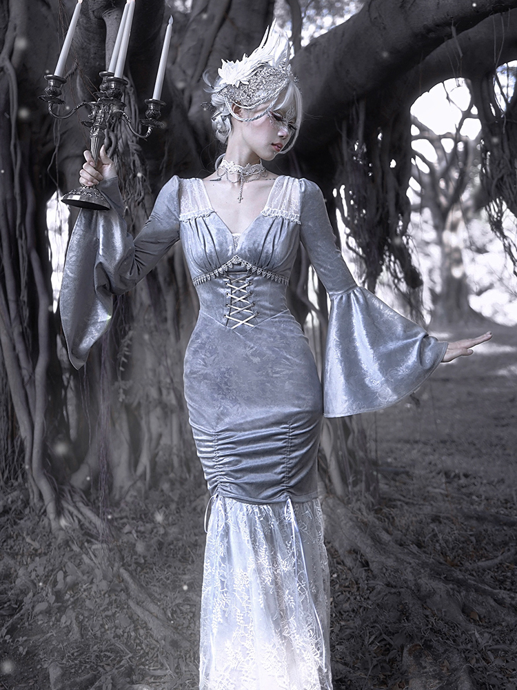 This dress is inspired by a silver-gray elegant atmosphere, like the mysterious swan in winter. The dress emphasized the body curve with an elegant trumpet-shaped cuff and double-layered skirt which is adjustable with an elastic drawstring. The fishtail hem part is made of stitching sequined lace fabric, giving the feelings of a goddess in oil paintings.