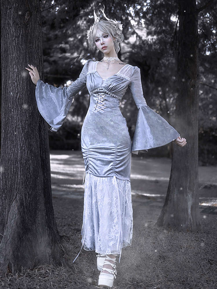 Swan Dream Gray Purple Embroidery European Style White Gothic Lace Princess Winter Fishtail Dress