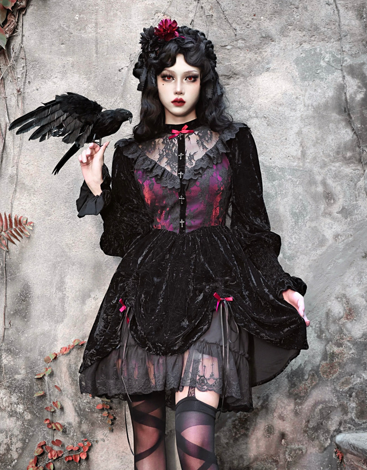 Dark Gothic Dream Rose Lace Drawstring Velvet Puff Sleeve Dress
