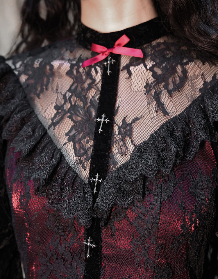 Time to embrace your gothic girl dream! The dress is made of red light fabric and stitching lace with a hollow standing collar, decorated with bows and small metal cross buttons. Pleated velvet fabric is adjustable with a drawstring, comfortable to wear.