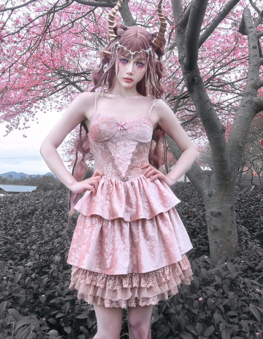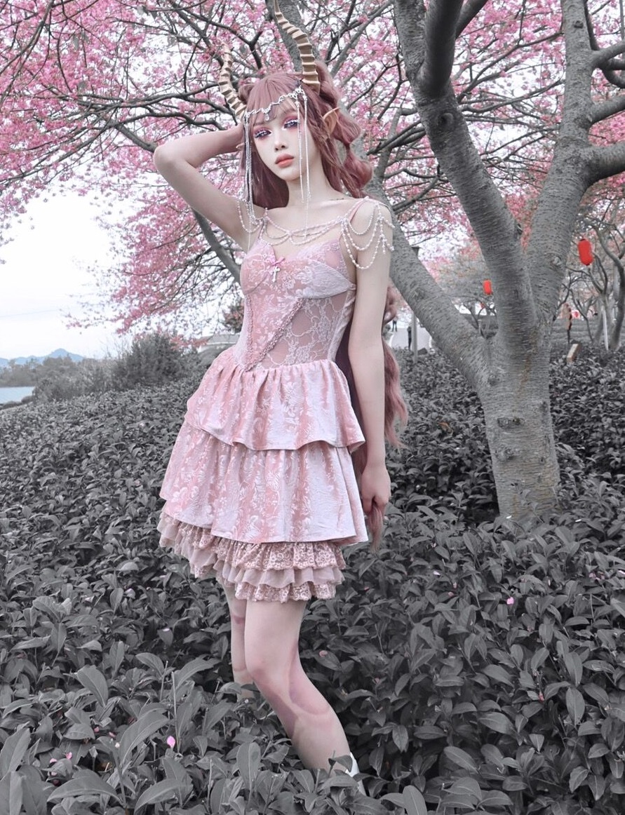 Let us introduce the โGuardian of Cherry Tressโ dress, made of elastic velvet fabric, inspired by roses, cherry blossoms, gentle lotus root, and spring romance.