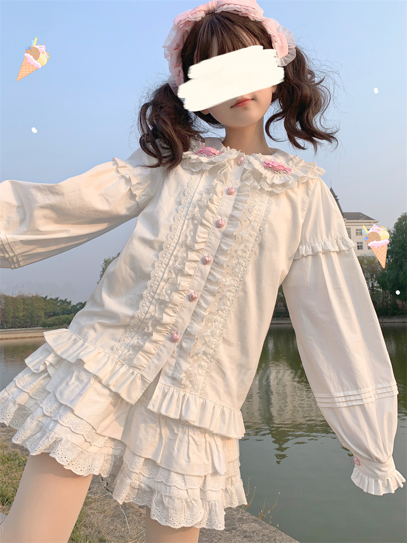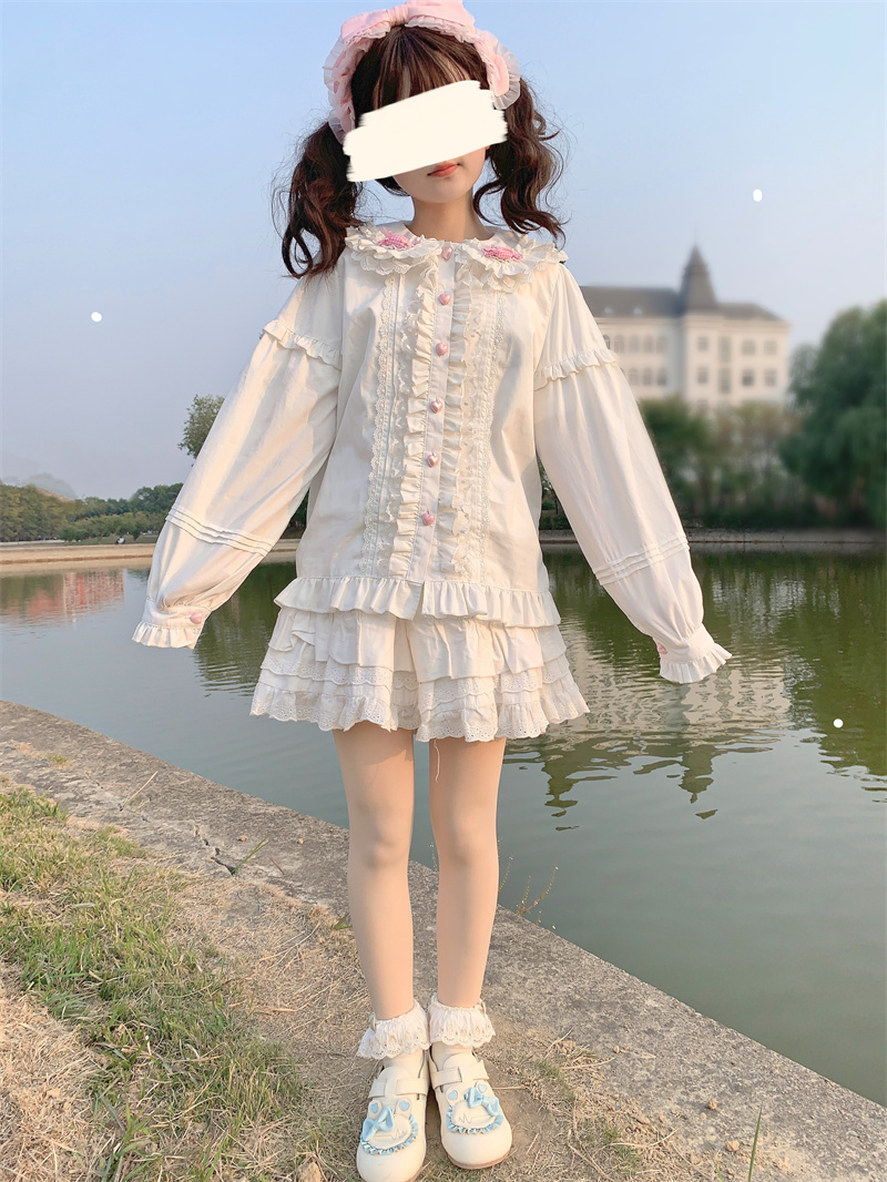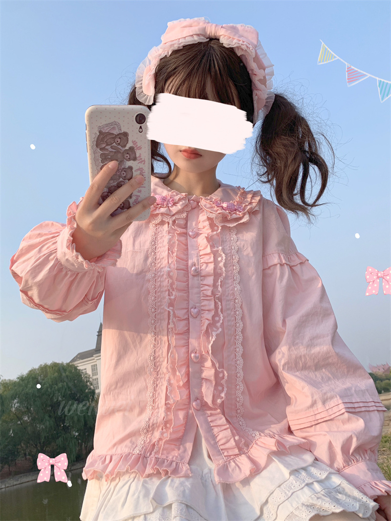 Japanese Girl Cute Doll Collar Elegant Lace Pink & White Long Sleeve T Shirt Blouse Top