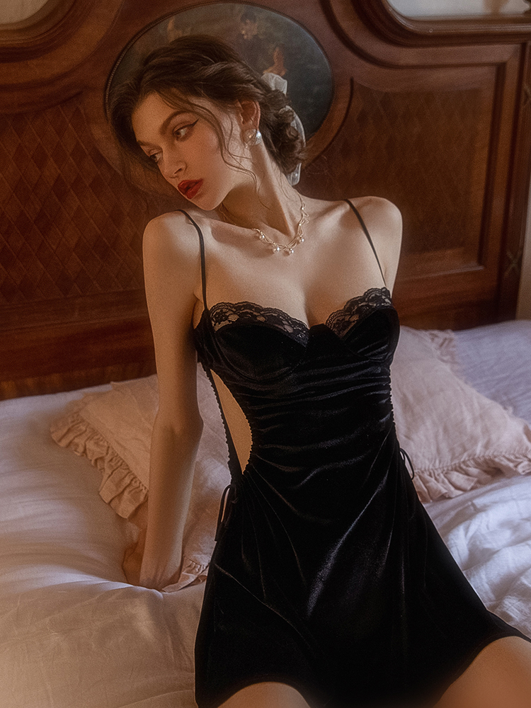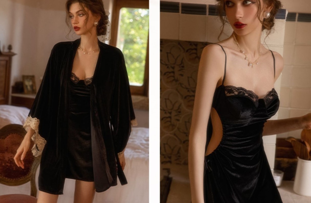Sexy Elegant Classic Women Velvet Silk See Through Lace Embroidery Pink Black White Lingerie Pajamas Nightdress Nightgown Robe Two Piece Set
