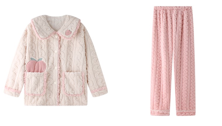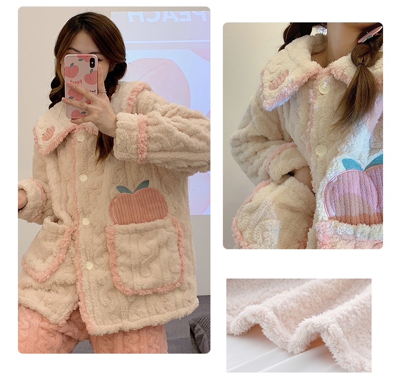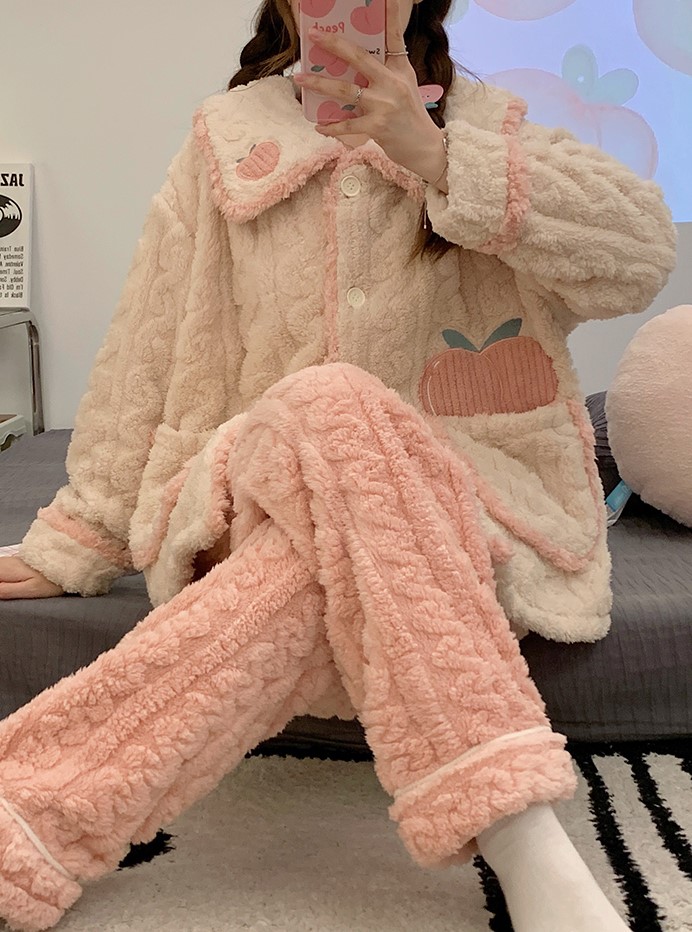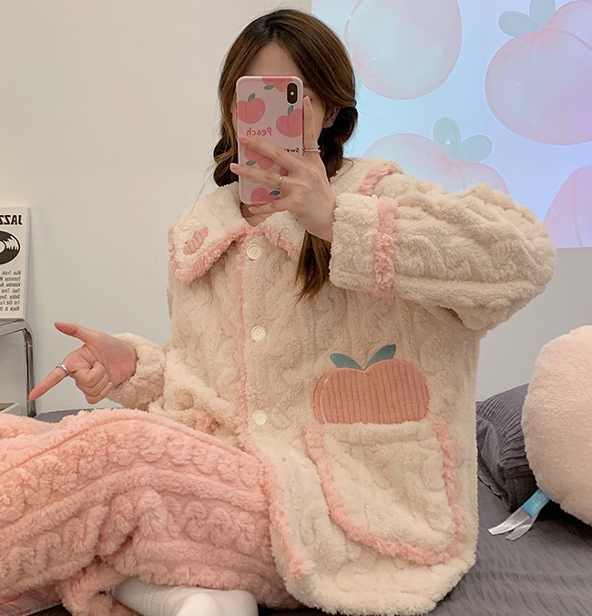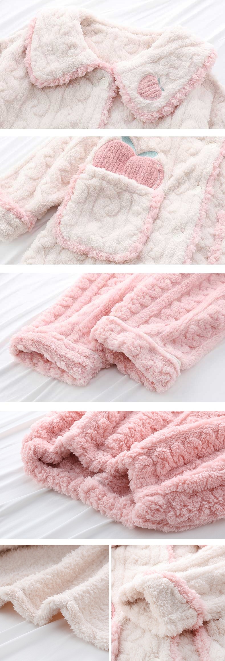 Pink Peach Cute Girl Plush Coral Fleece Warm Winter Pajamas Sleepwear Long Sleeve Tops & Pants Two Piece