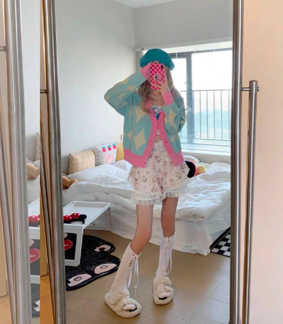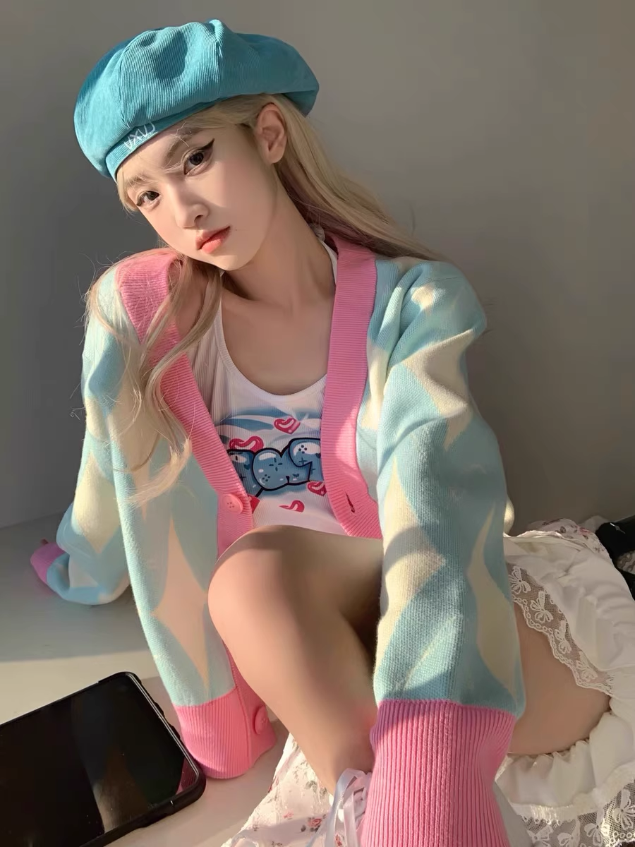 Pastel Pink and Blue Argyle Diamond Pattern Autumn Spring Cozy Knitted Sweet Causal Girl Cardigan Sweater