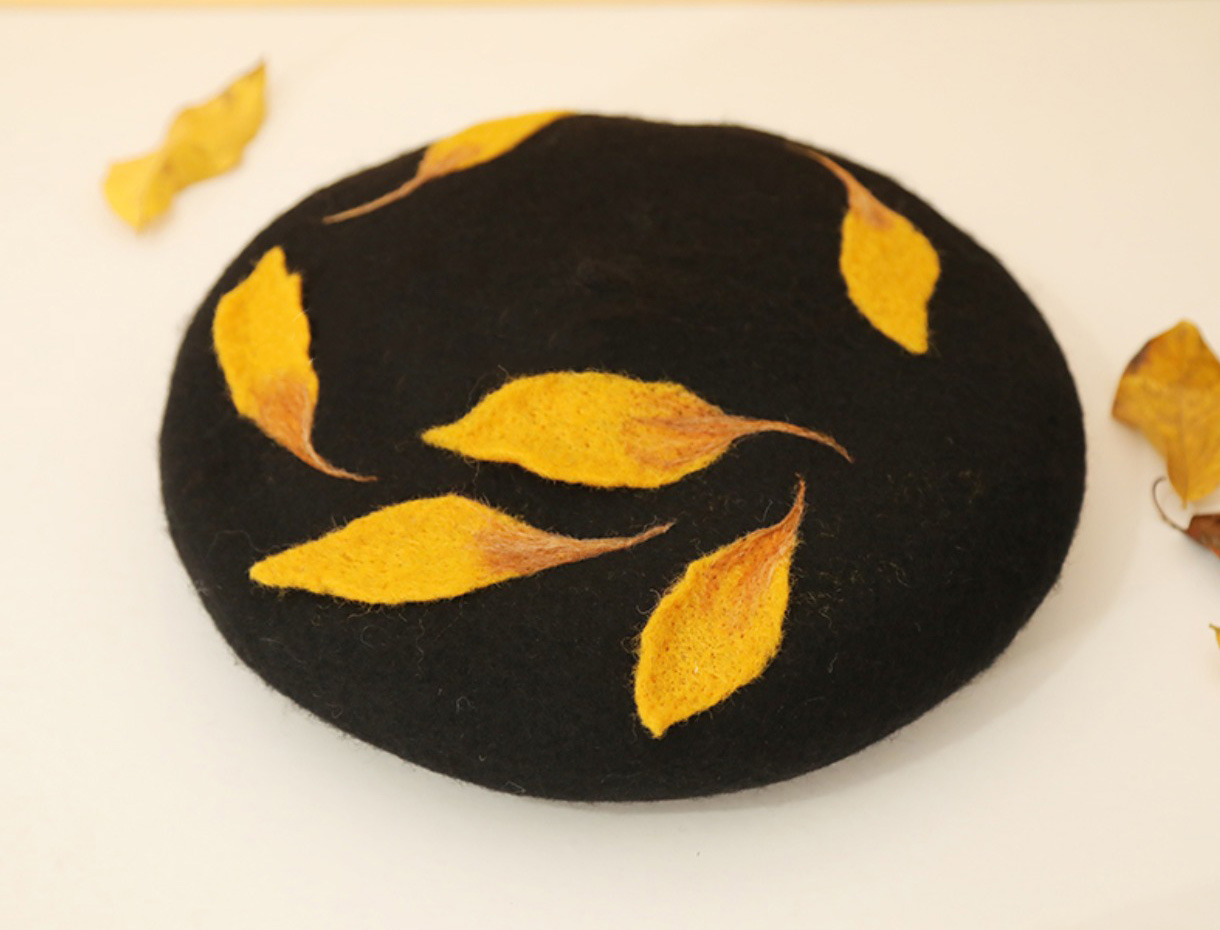 The leaf pattern on the hat is made of handmade wool felt. The material is imported wool combined with embroidery, beading, hand sewing, and other techniques. Please understand that there may be some tiny hand-stitching traces.