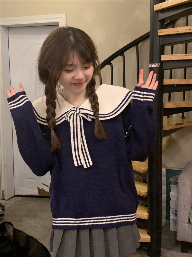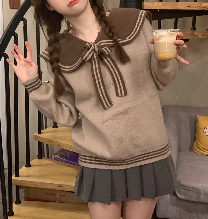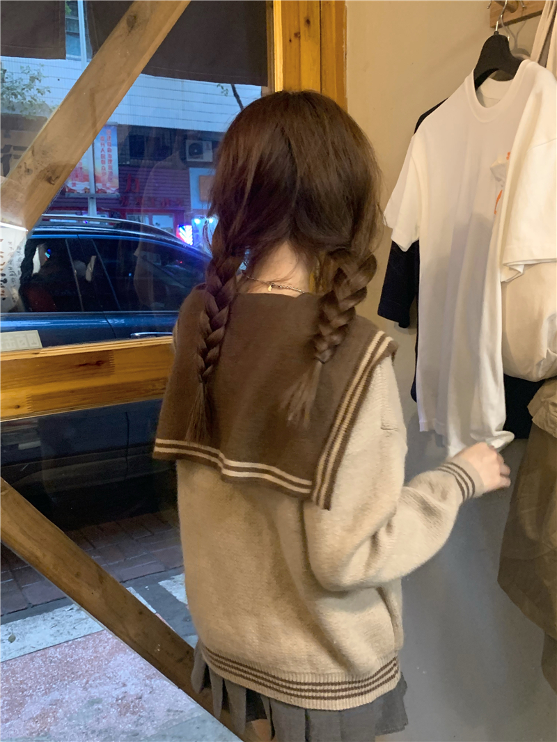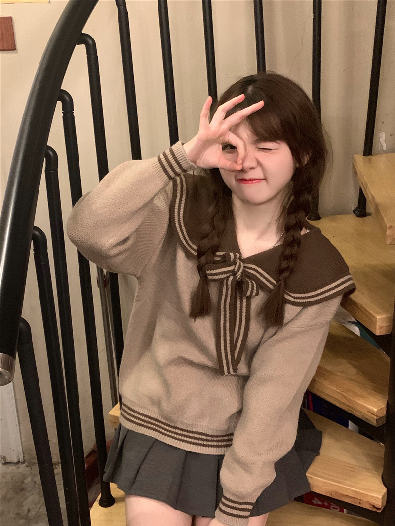 Sweet Little Sailor Collar Brown & Navy Blue Spring Autumn College Girl Style Cozy Sweater