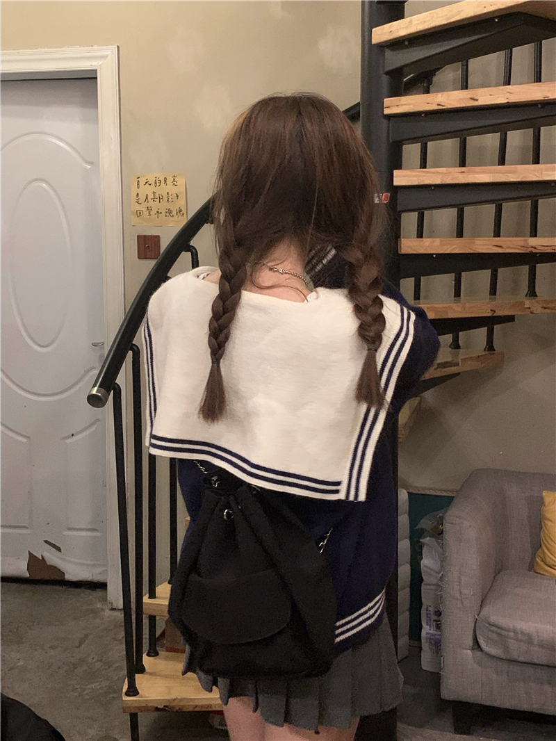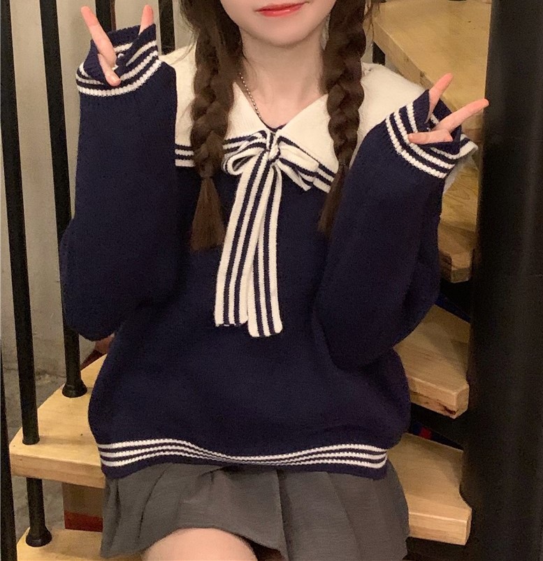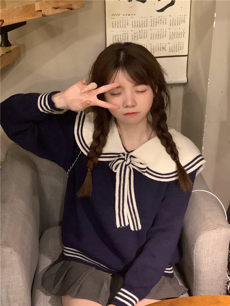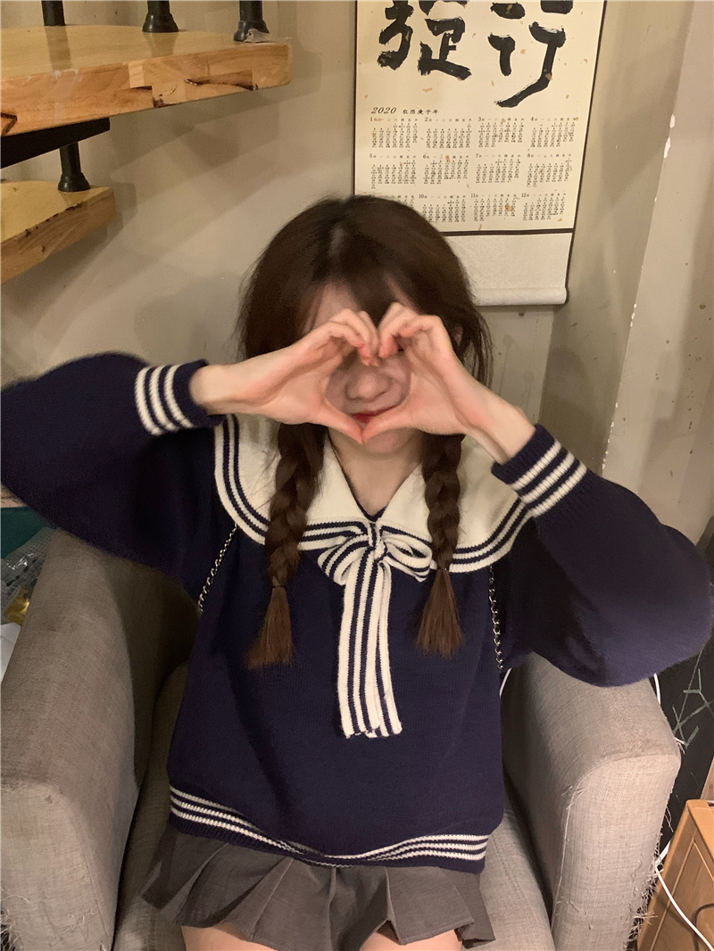 Sweet Little Sailor Collar Brown & Navy Blue Spring Autumn College Girl Style Cozy Sweater
