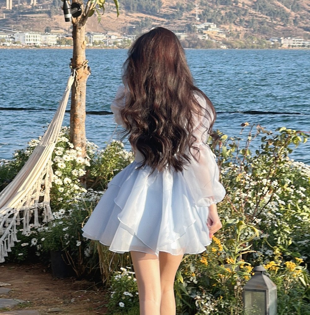 Women Girl Fashion Spring Summer Puff Sleeve Tutu Blue Dress