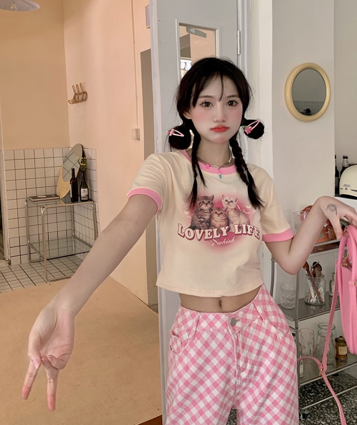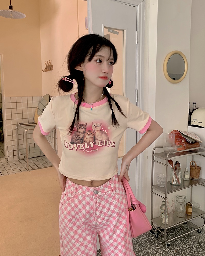 Street Fashion Cool Women Girl Retro Waist Wide Leg Sweet Pink Pattern Pants Trousers Jeans